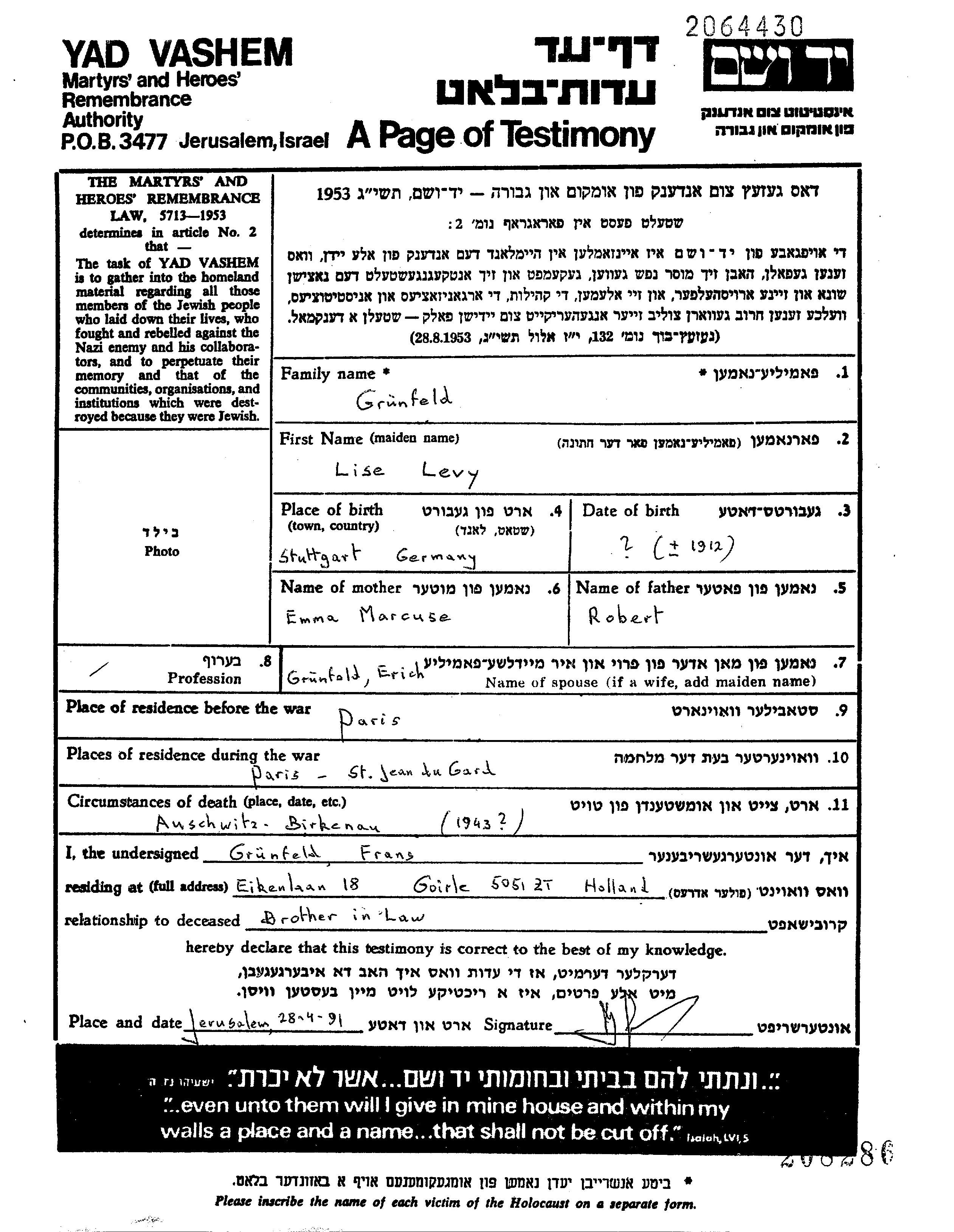 Lise Grünfeld, geb. Levy wurde im Jahr 1910 in Stuttgart, Deutsches Reich geboren. Vor dem Zweiten Weltkrieg lebte sie in Paris, Frankreich.