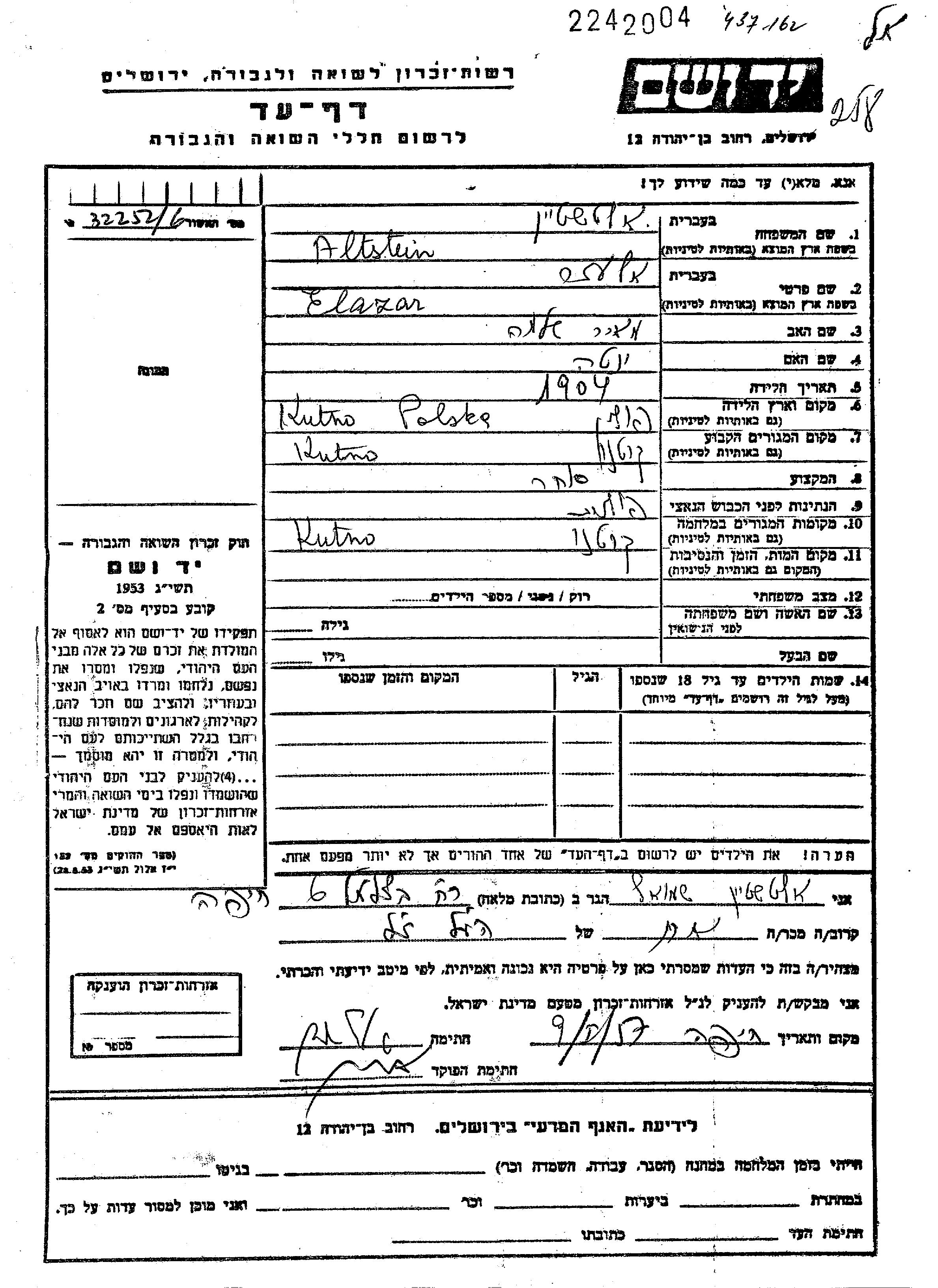 Elazar Altstein wurde im Jahr 1904 in Kutno, Polen geboren. Er war der Sohn von Meir Shlomo und Yente, geb. Sobel. Er war Kaufmann/-frau und Ledig. Vor dem Zweiten Weltkrieg lebte er in Kutno, Polen. Während des Krieges war er in Kutno, Polen.