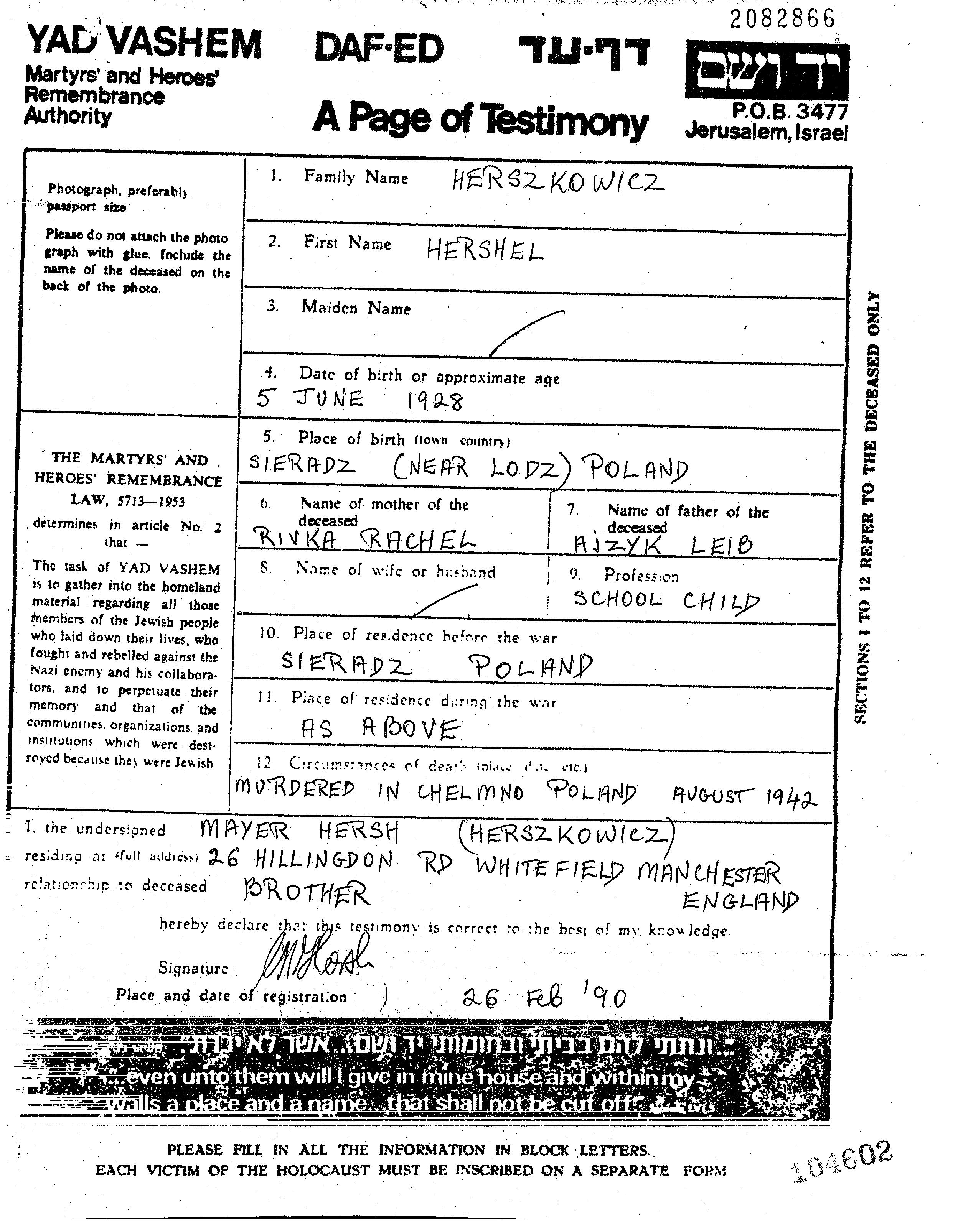 Herszkowicz Hershel 1928 Sieradz, Polen Gedenkblatt