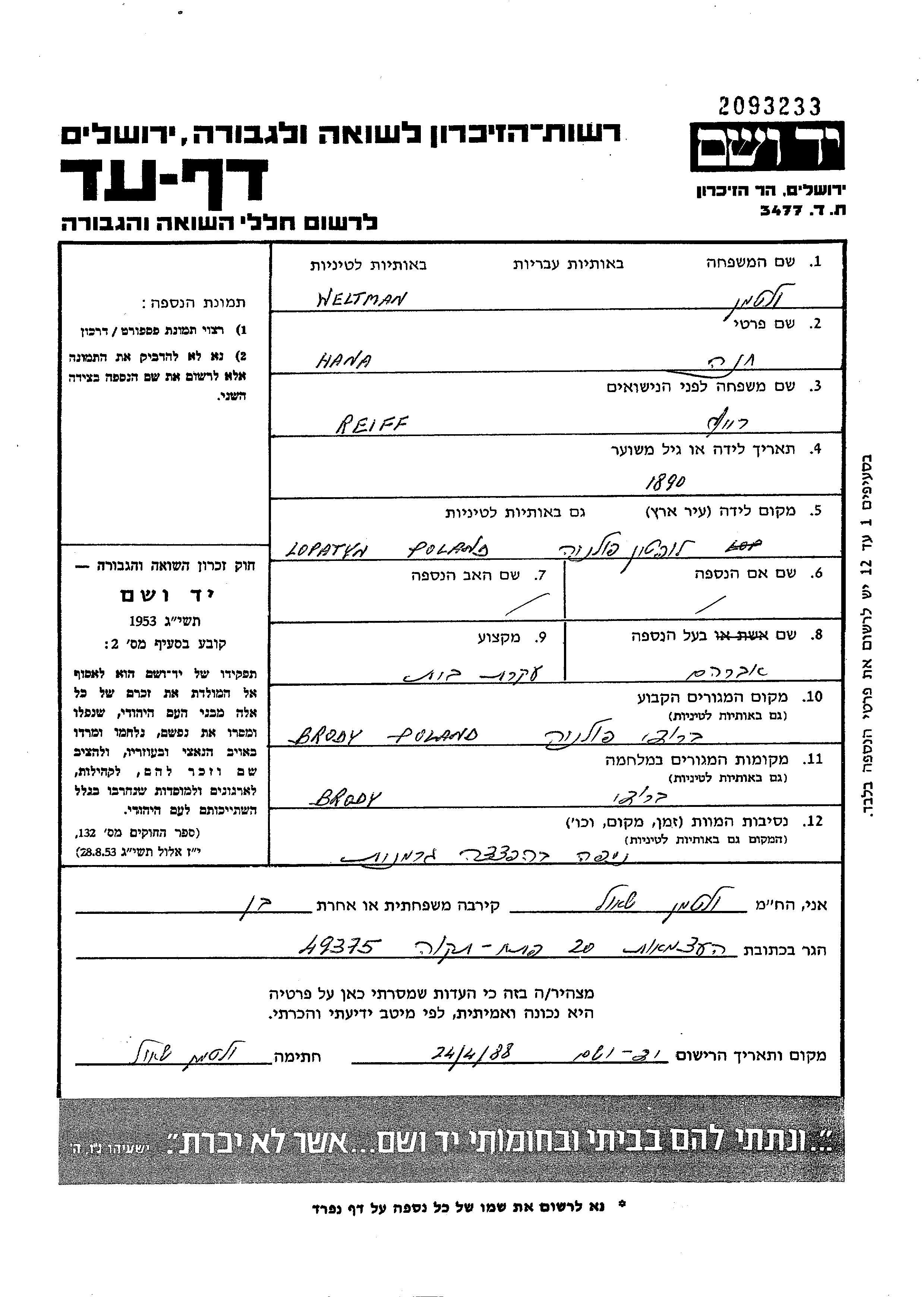 Khana Weltman, geb. Reiff wurde in Lopatyn, Polen geboren. Sie war Hausfrau. Vor dem Zweiten Weltkrieg lebte sie in Brody, Polen.