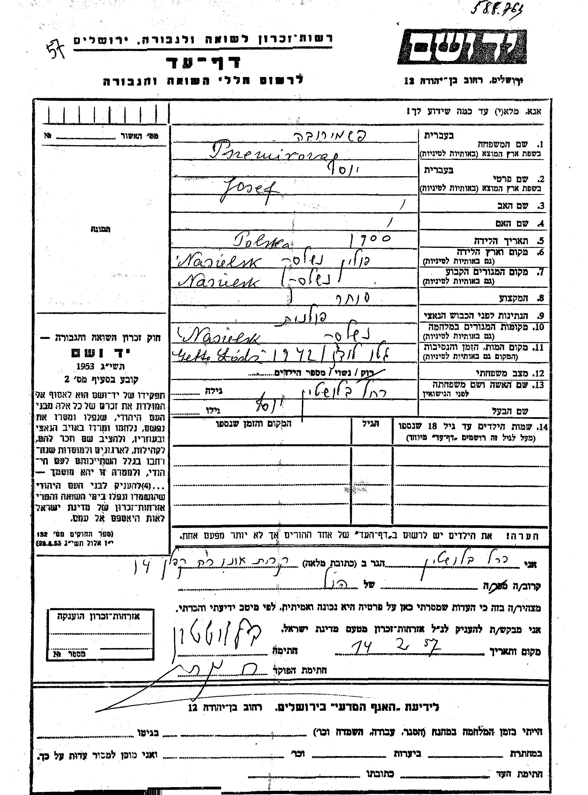 Yosef Pszemirowa wurde im Jahr 1900 in Nasielsk, Polen geboren. Er war Kaufmann/-frau. Vor dem Zweiten Weltkrieg lebte er in Nasielsk, Polen.