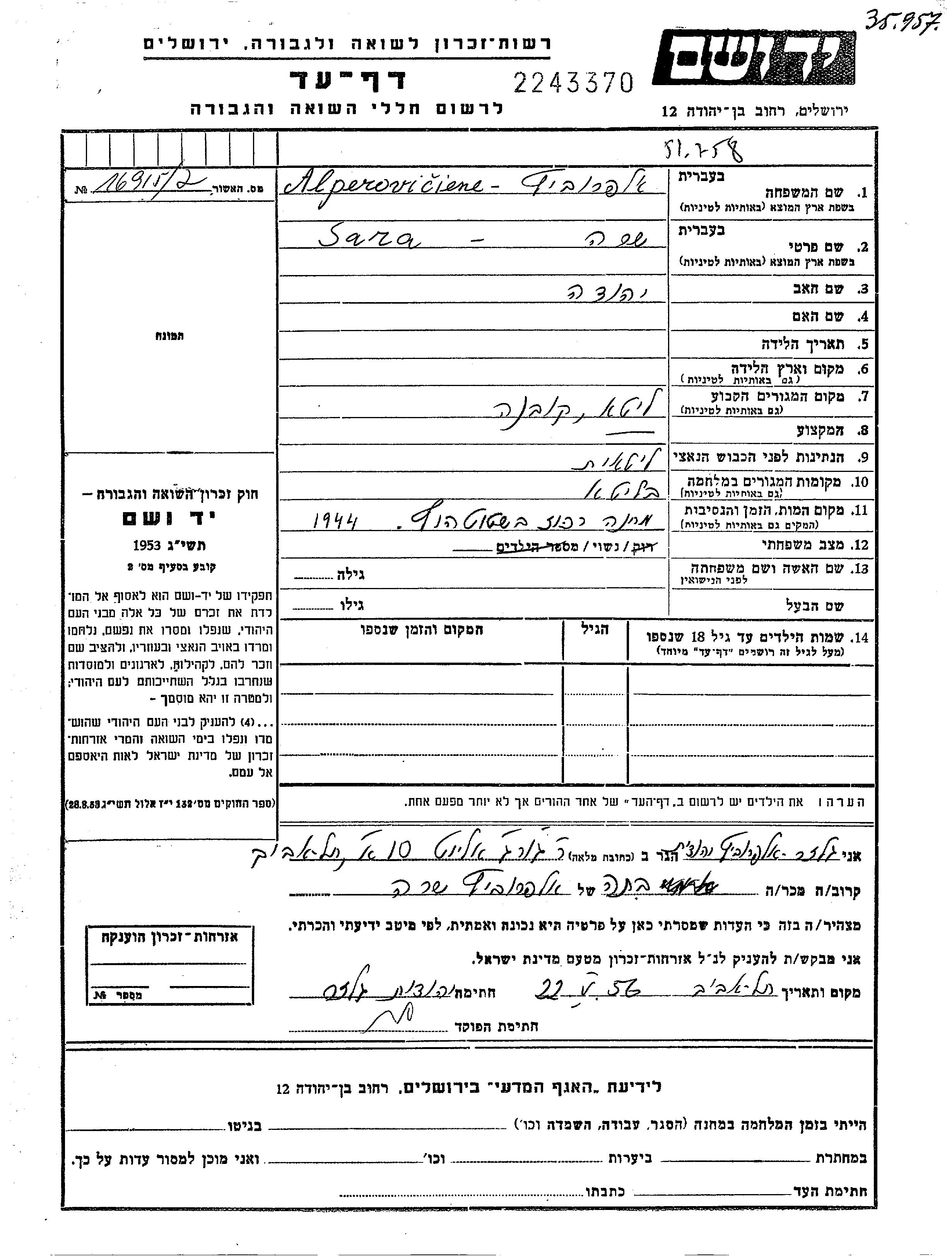 Sara Alperovic wurde Sie war die Tochter von Yehuda. Sie war mit Jokubas Verheiratet. Vor dem Zweiten Weltkrieg lebte sie in Kowno, Litauen. Während des Krieges war sie in Litauen.