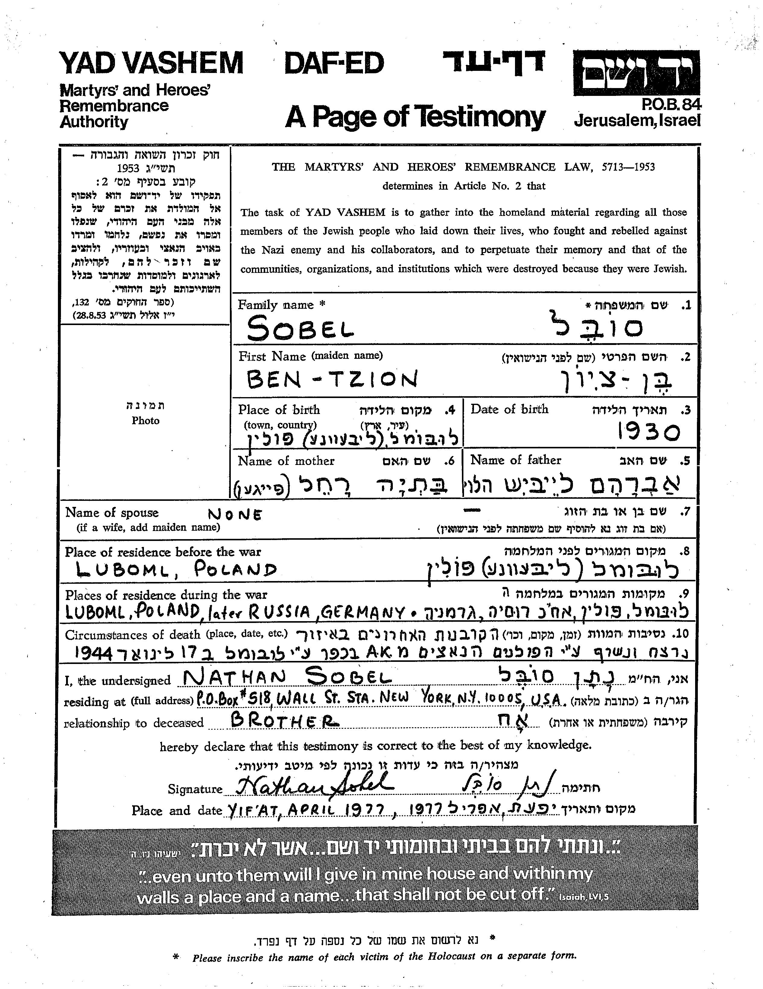 Bentzion Sojbel wurde im Jahr 1930 in Lubomil, Polen geboren. Vor dem Zweiten Weltkrieg lebte er in Lubomil, Polen.