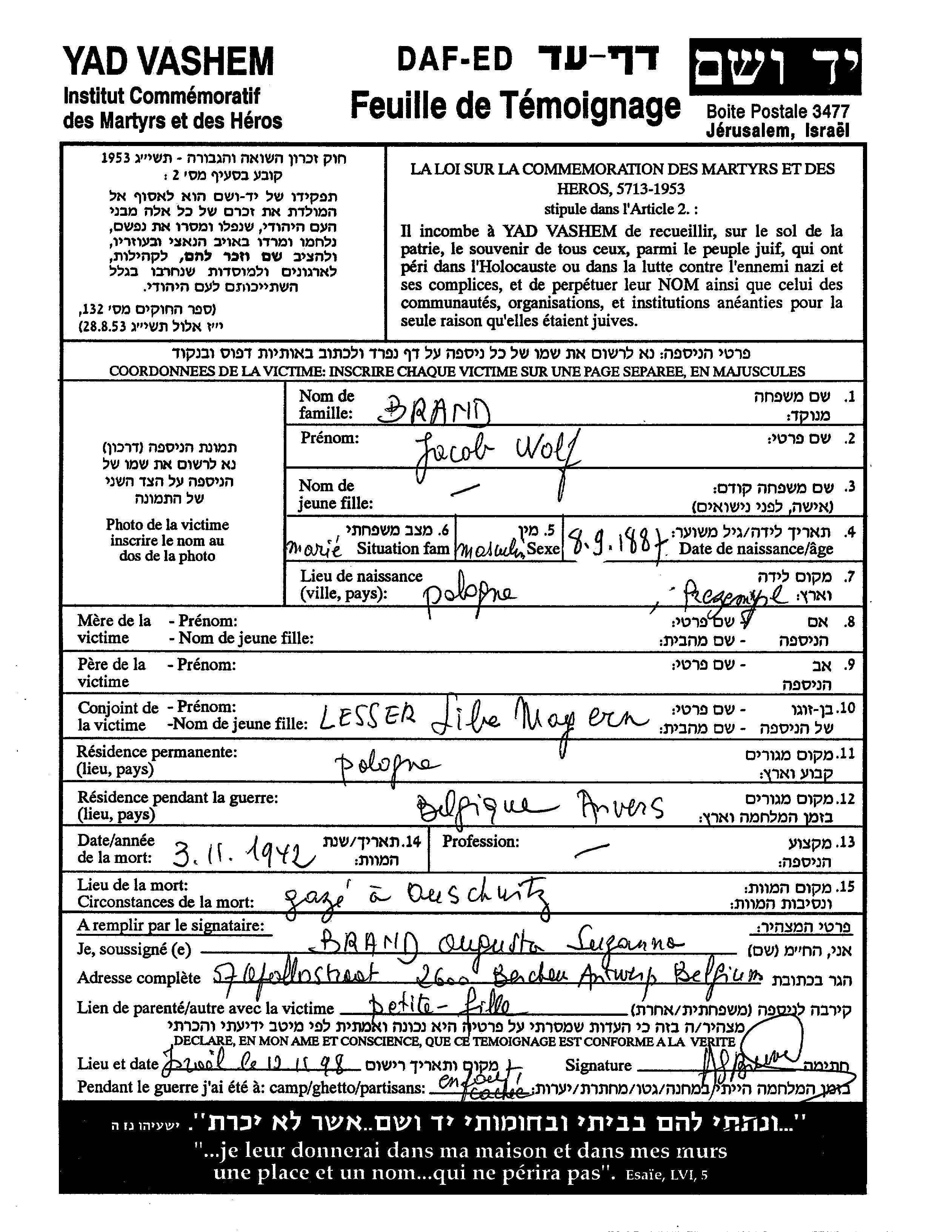 Wolf Yacob Brand wurde im Jahr 1887 in Przemysl, Polen geboren. Vor dem Zweiten Weltkrieg lebte er in Polen.