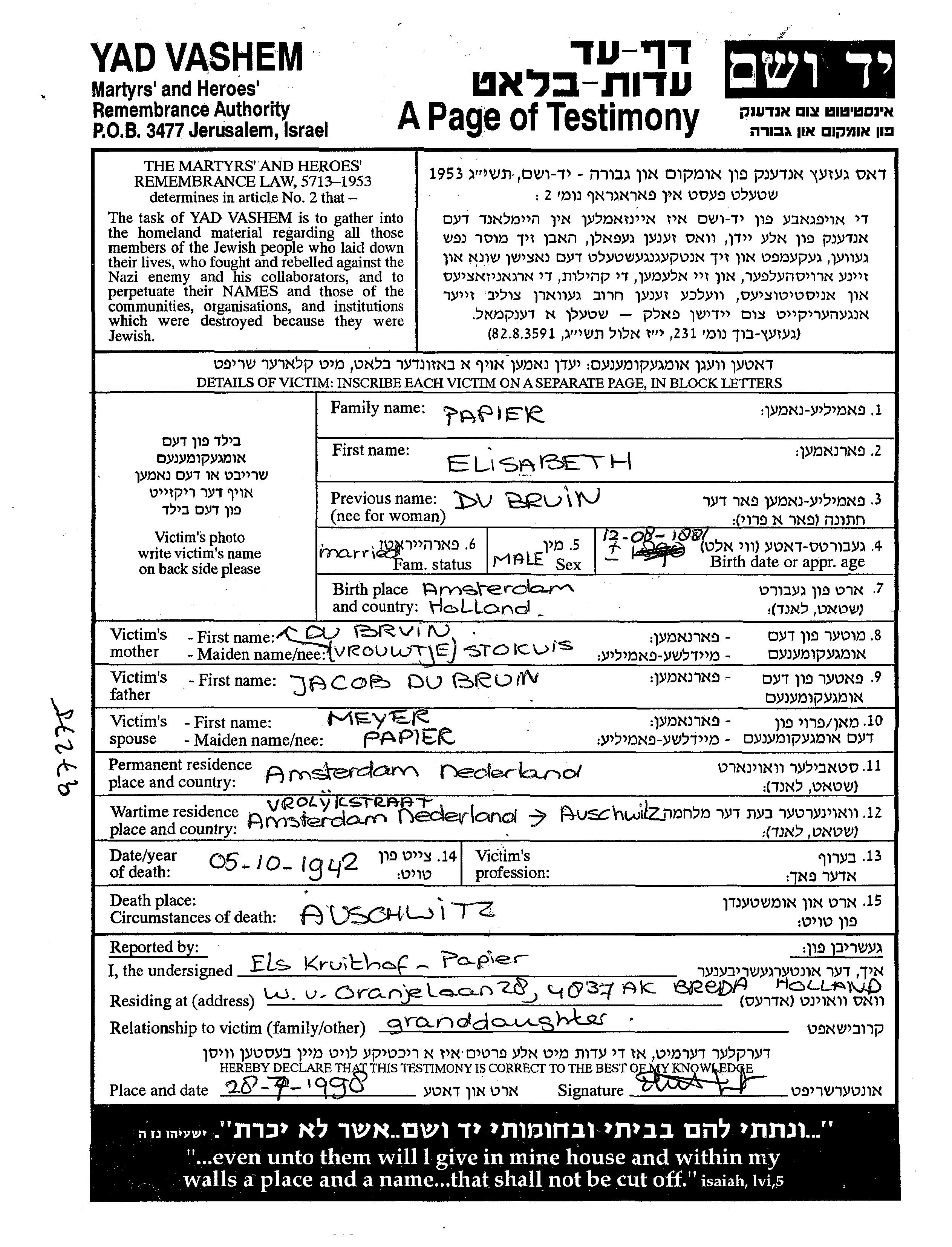 Elisabeth Papir, geb. Bruen Du Bruin Du wurde im Jahr 1881 in Amsterdam, Niederlande geboren. Sie war Kaufmann/-frau. Vor dem Zweiten Weltkrieg lebte sie in Amsterdam, Niederlande.