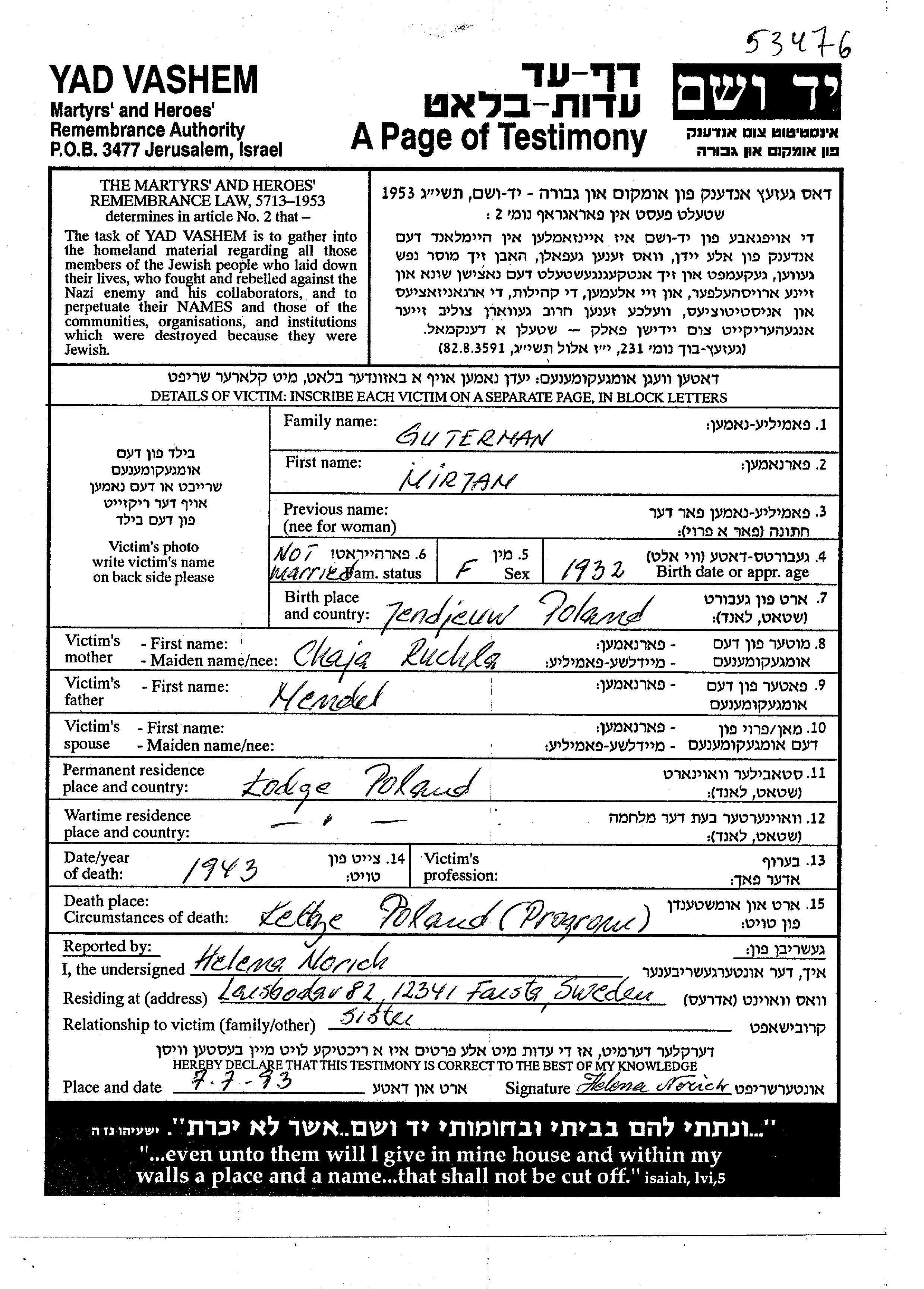 Guterman Mirjam 1932 Lodz, Polen Gedenkblatt