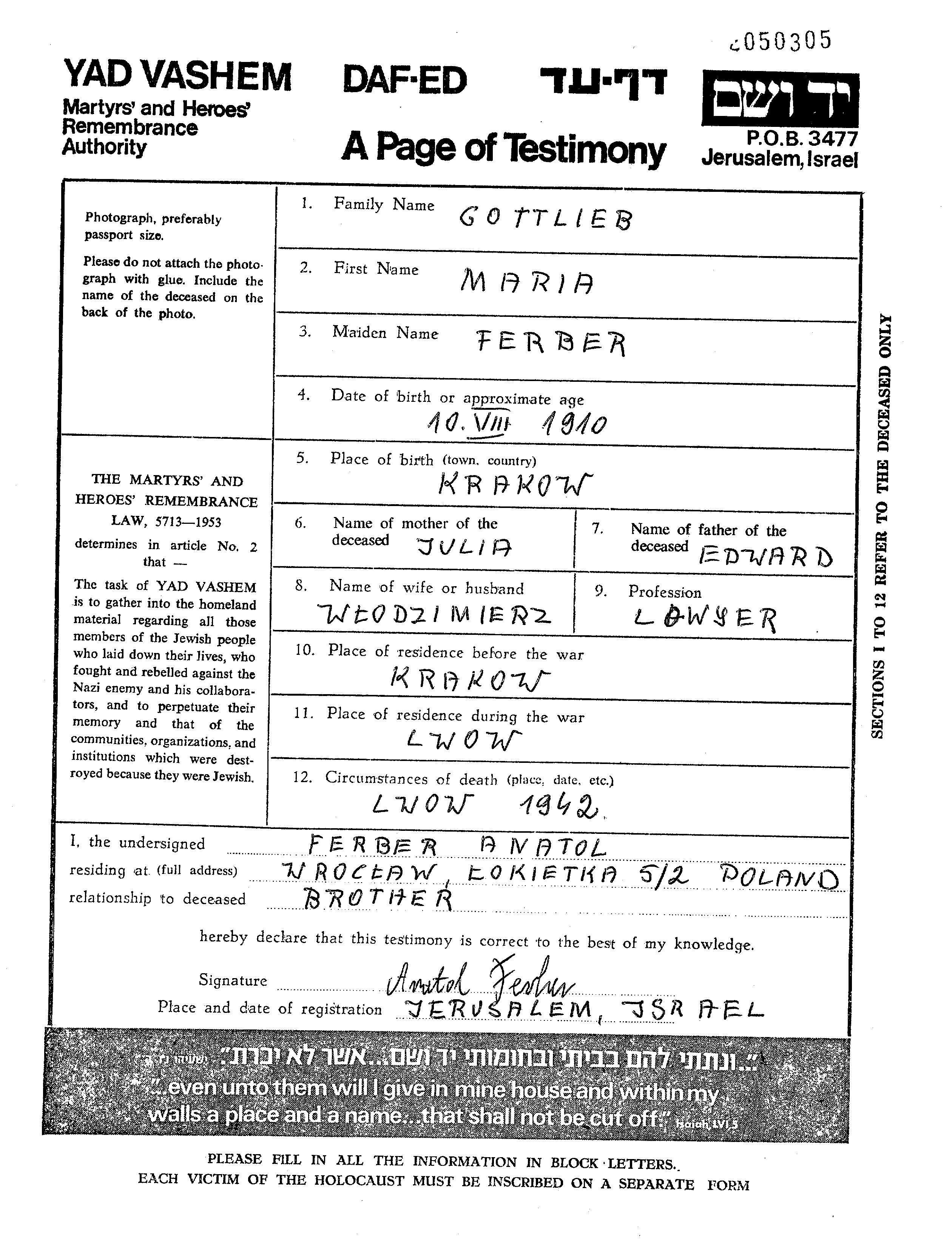 Maria Gottlieb, geb. Ferber wurde im Jahr 1910 in Krakow, Polen geboren. Sie war Rechtsanwalt/rechtsanwältin. Vor dem Zweiten Weltkrieg lebte sie in Krakow, Polen.