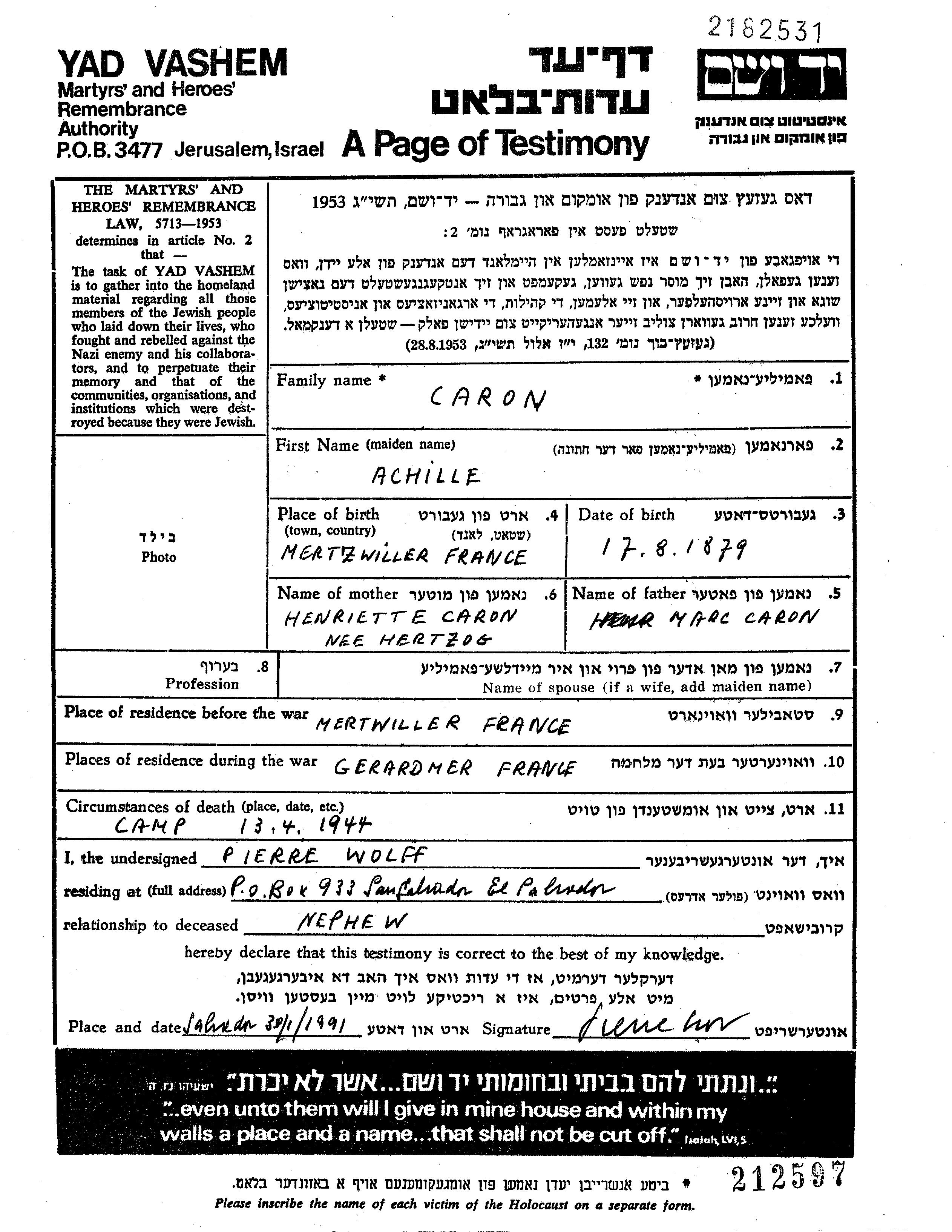 Yekhiel Achille Caron Kron wurde im Jahr 1879 in Mertzwiller, Frankreich geboren. Vor dem Zweiten Weltkrieg lebte er in Mertzwiller, Frankreich.