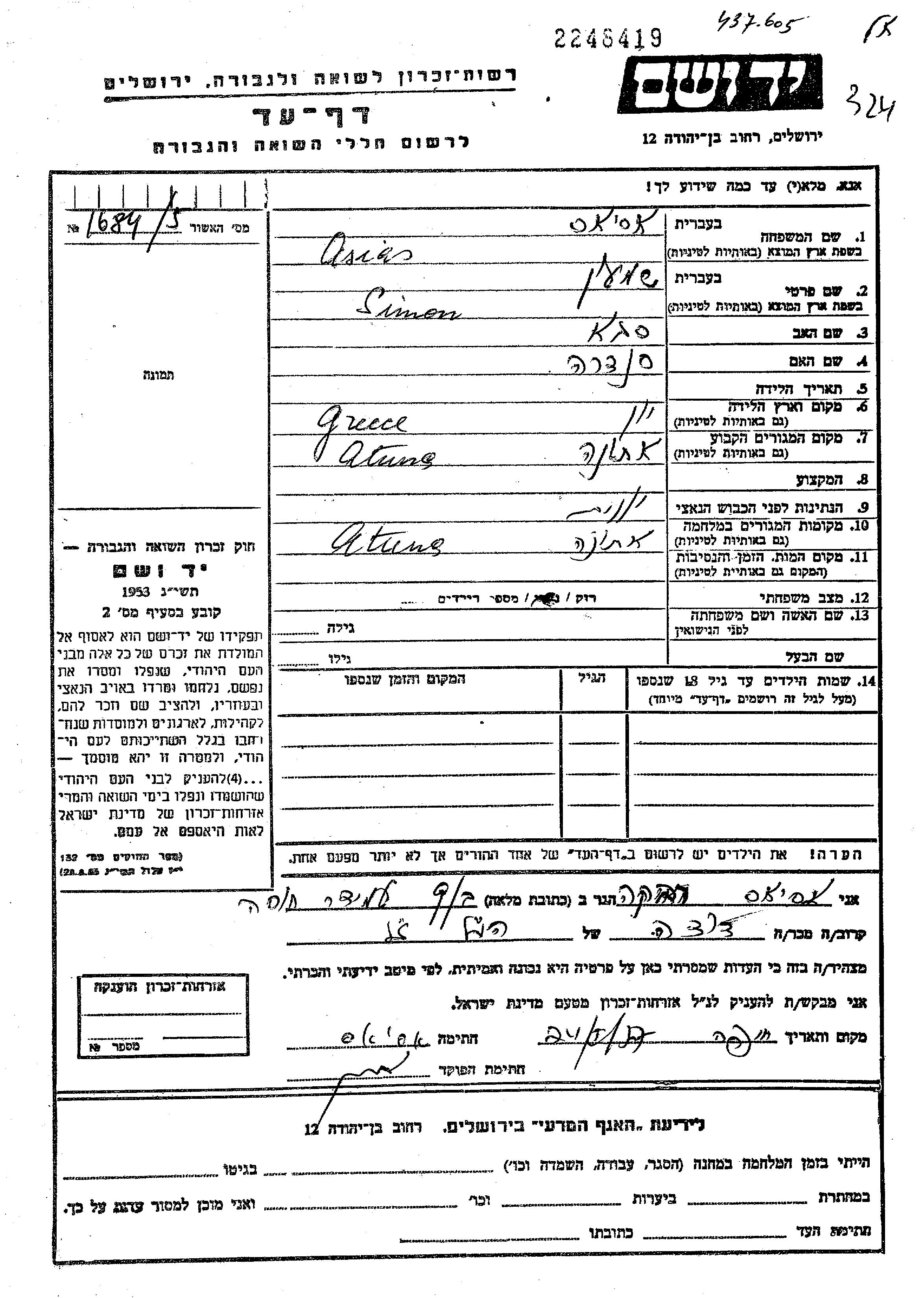 Simon Asias wurde in Griechenland geboren. Er war der Sohn von Sava und Sandra. Er war Ledig. Vor dem Zweiten Weltkrieg lebte er in Athens, Griechenland. Während des Krieges war er in Athens, Griechenland.