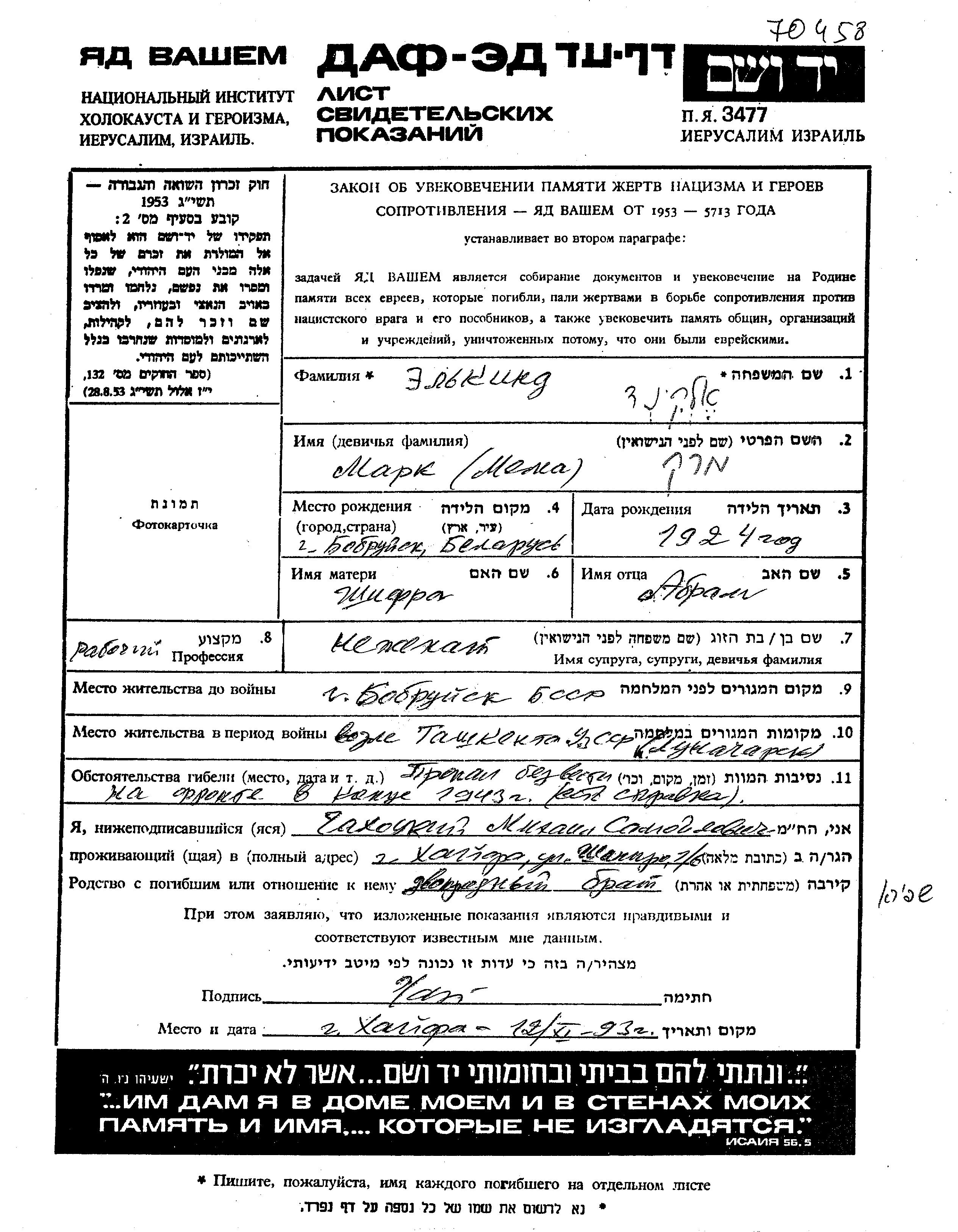 Mark Mema Mesha Elkind wurde im Jahr 1924 in Bobruysk, Weißrussland (UdSSR) geboren. Er war Arbeiter/-in. Vor dem Zweiten Weltkrieg lebte er in Bobruysk, Weißrussland (UdSSR).