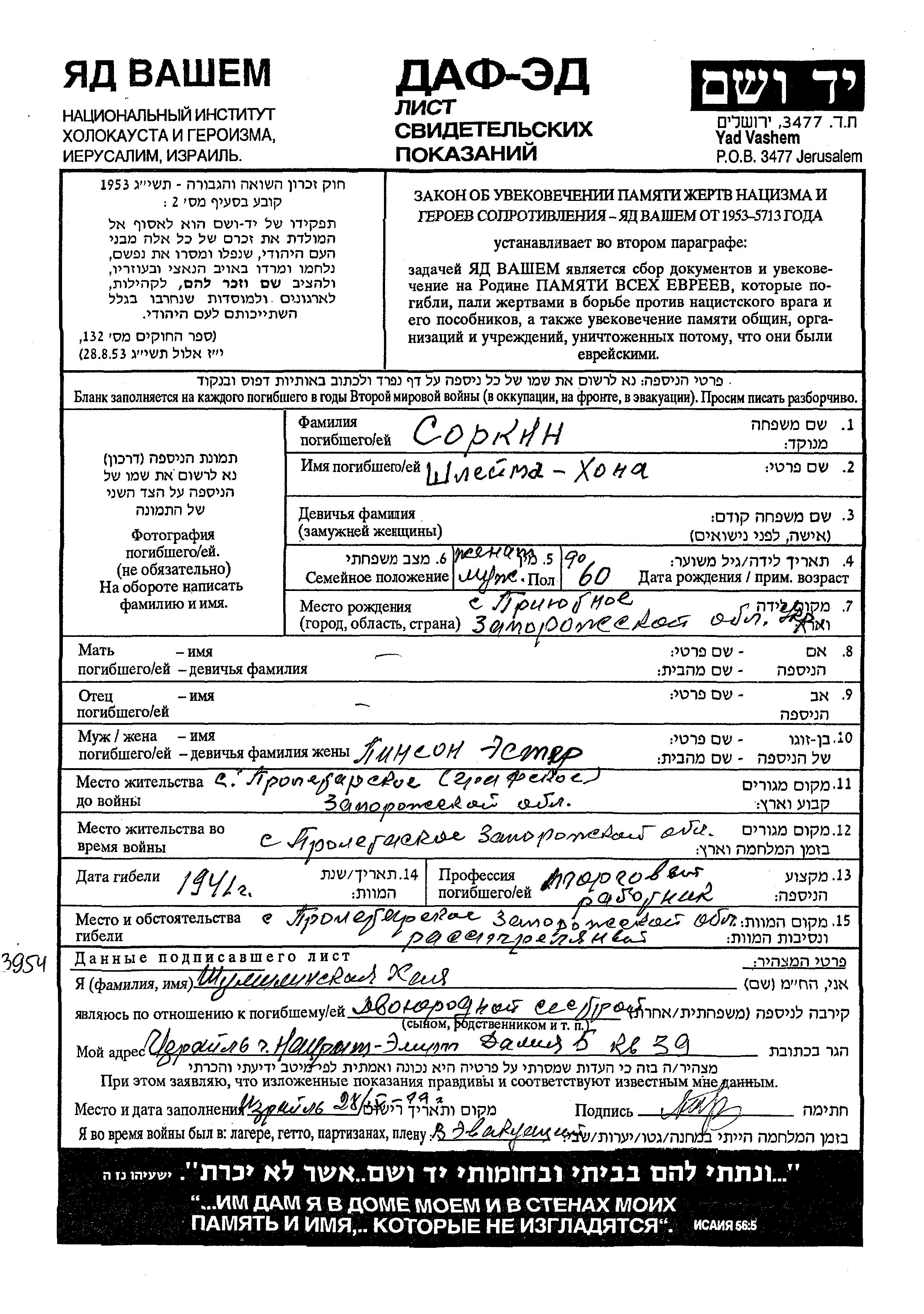 | Sorkin | Shleima Khona | Grafskaya, Ukraine (UdSSR) | Gedenkblatt | |