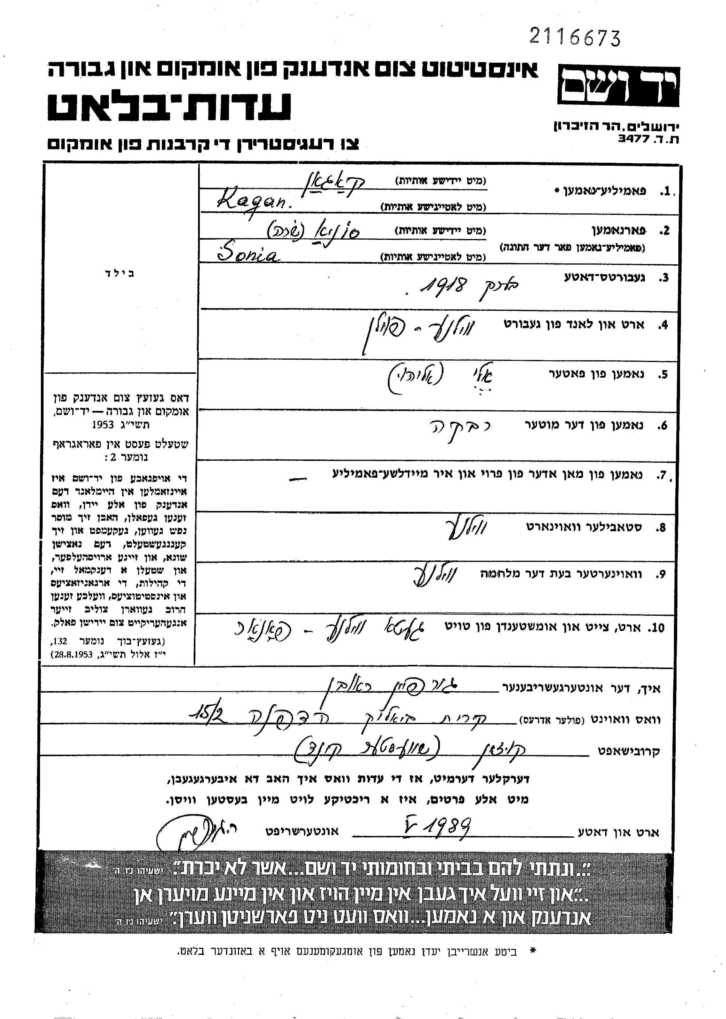 Kagan Sonia Sara Wilno, Polen Gedenkblatt