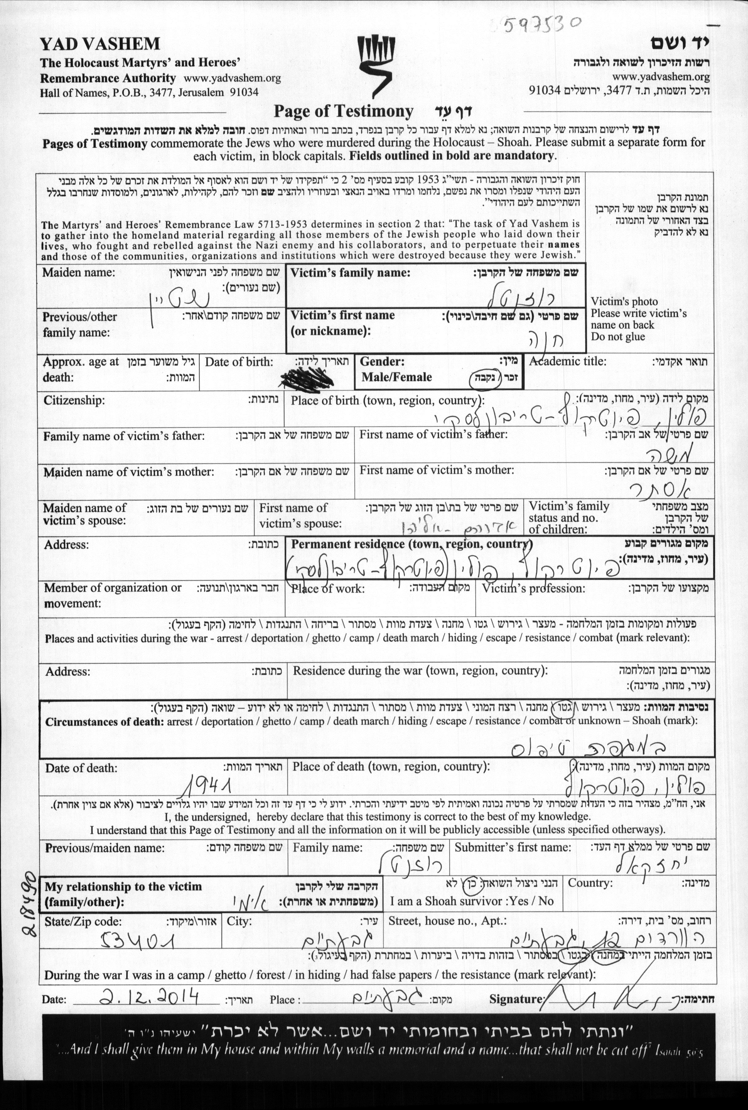 Rozental Chana Piotrkow Trybunalski, Polen Gedenkblatt