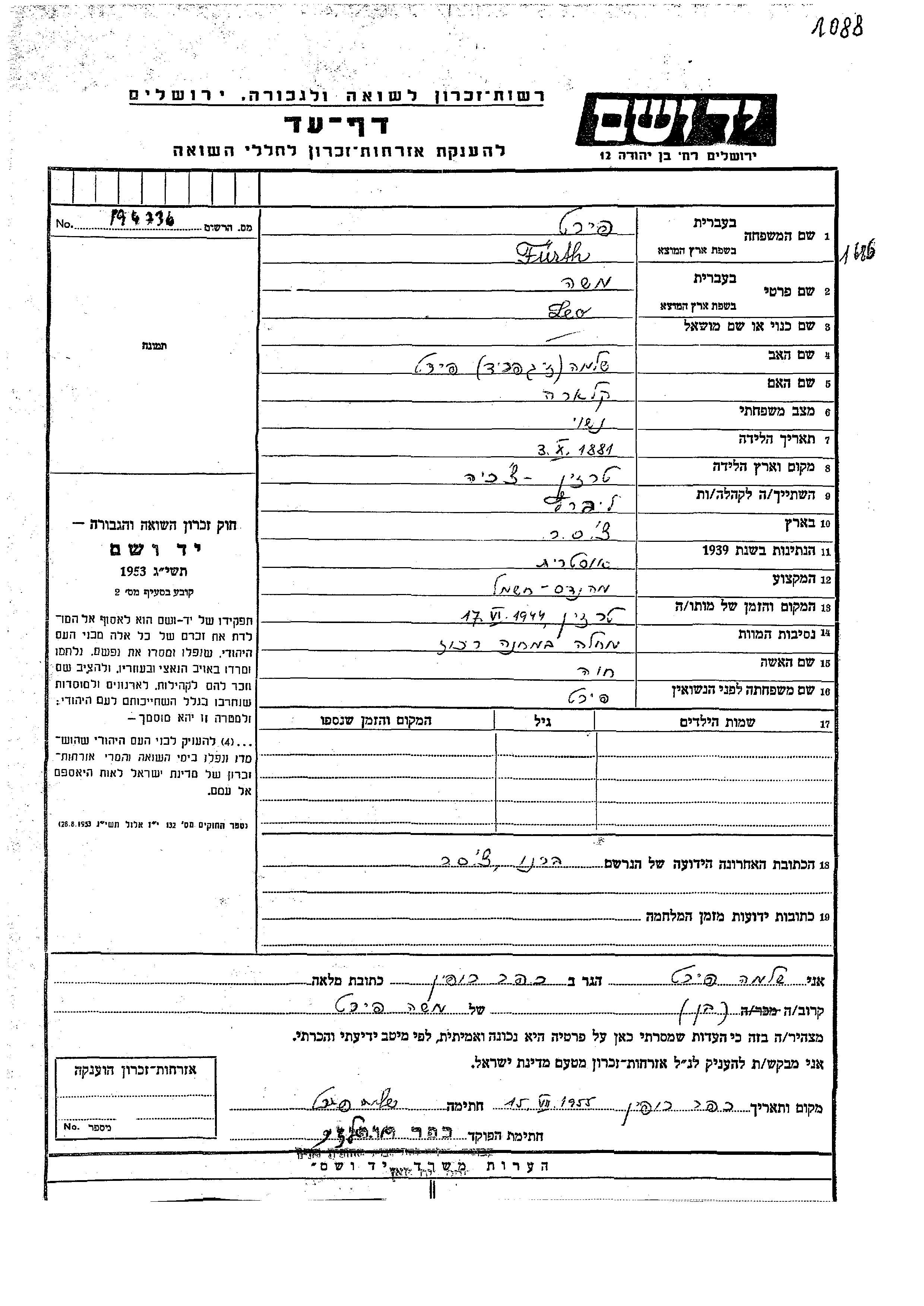 Suche nach einem Todesjahr im Zeitraum der Holocaust: 1933 bis 1945. Bitte wählen Sie 'Exakt' im Auswahlmenü, um nur nach einem einzelnen Jahr zu suchen, alternativ können Sie die flexibleren Optionen '+/- 2 Jahre' oder '+/- 5 Jahre' wählen.