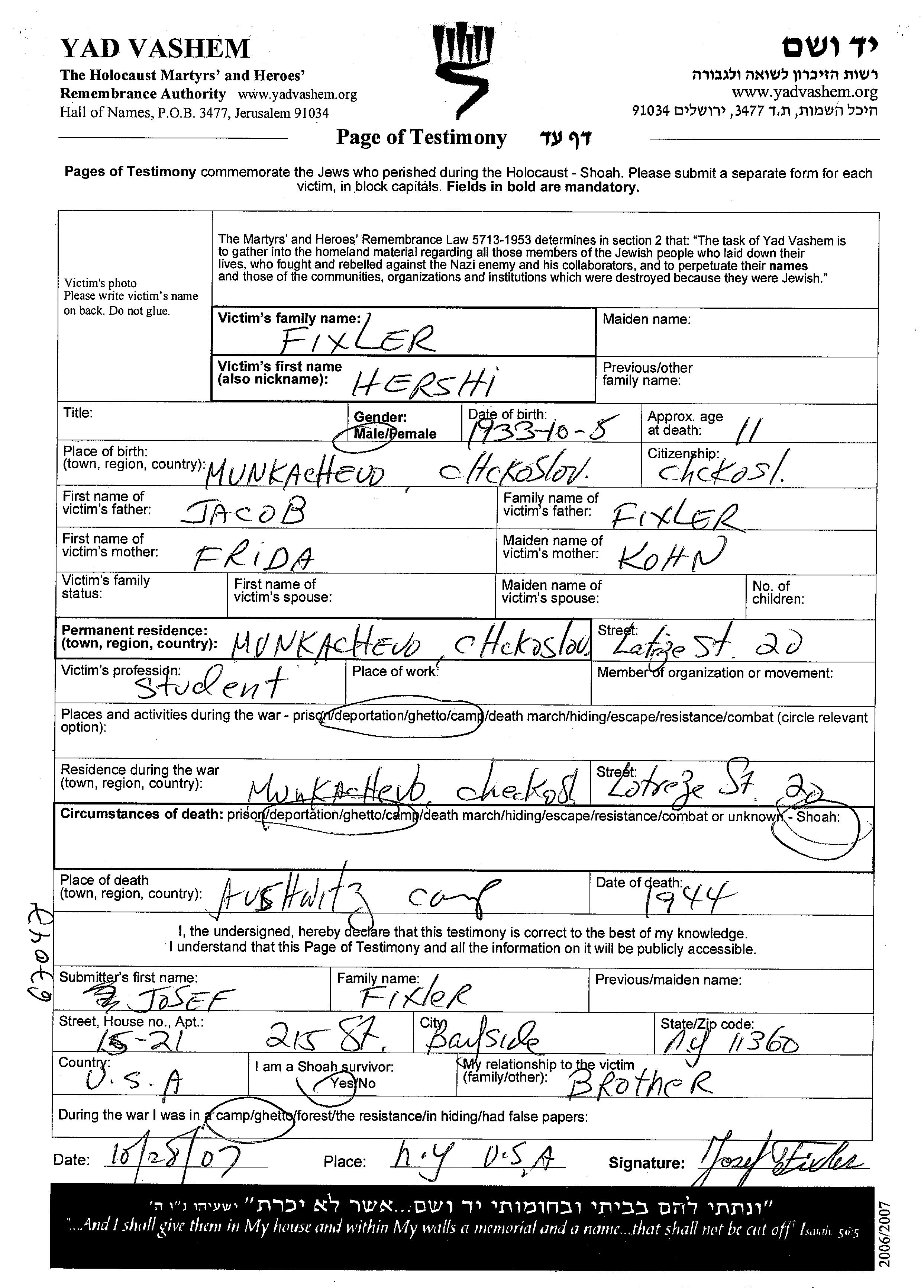 Hershi Aharon Fixler wurde im Jahr 1933 in Mukacevo, Tschechoslowakei geboren. Er war Student. Vor dem Zweiten Weltkrieg lebte er in Munkacevo, Tschechoslowakei.
