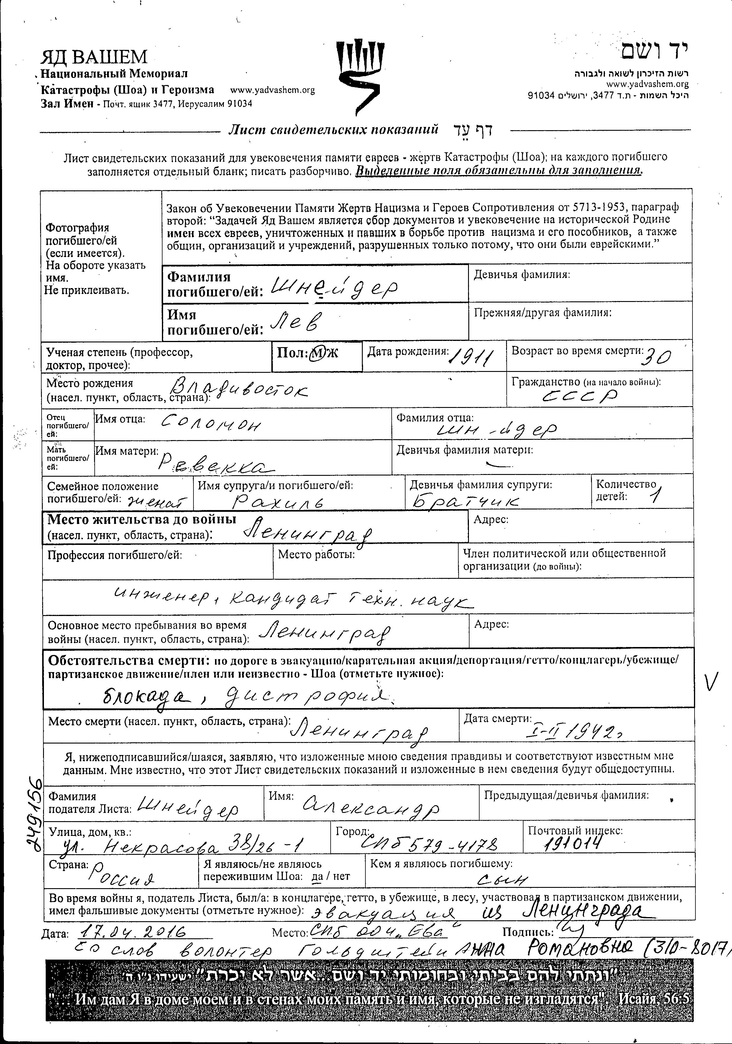 Lev Shneyder wurde im Jahr 1911 in Vladivostok, Russland (UdSSR) geboren. Vor dem Zweiten Weltkrieg lebte er in Leningrad, Russland (UdSSR). Lev wurde in der Zeit zwischen 1933-1945 in indirekter Beziehung mit der Shoah umgekommen. Todesort: Leningrad, Russland (UdSSR) im Jahr 01/1942.