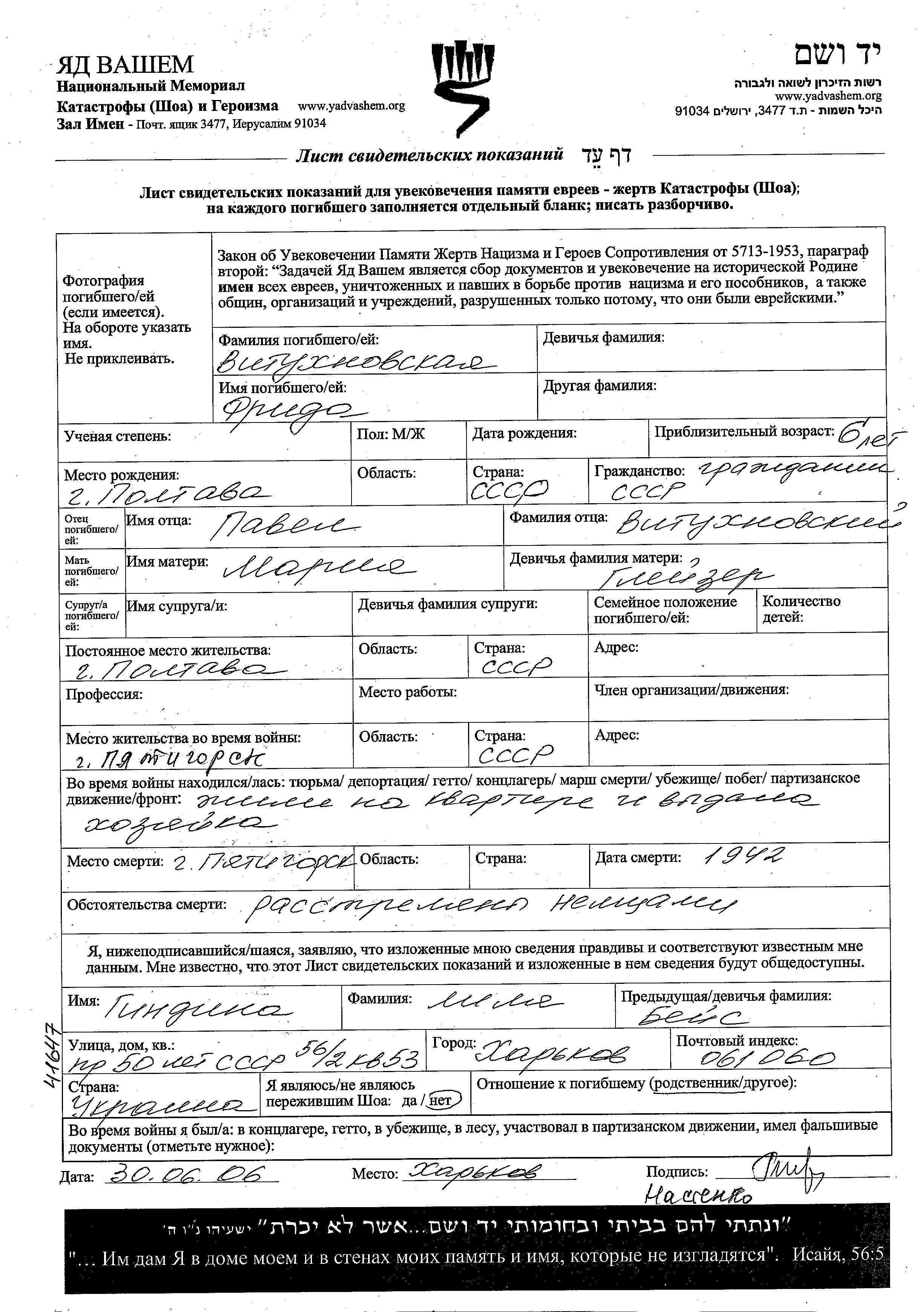 Frida Vitukhnovskaya wurde im Jahr 1935 in Poltava, Ukraine (UdSSR) geboren. Vor dem Zweiten Weltkrieg lebte sie in Poltava, Ukraine (UdSSR).