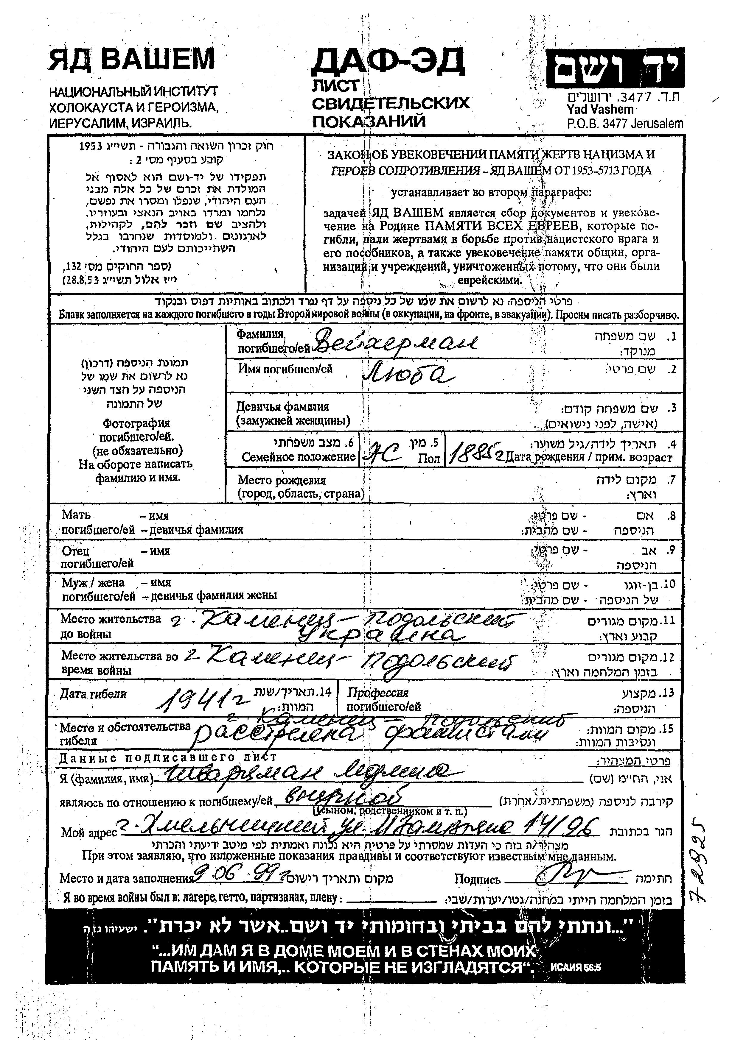 Veikherman | Lyuba | 1885 | Kamenets Podolskiy, Ukraine (UdSSR) | Gedenkblatt |
