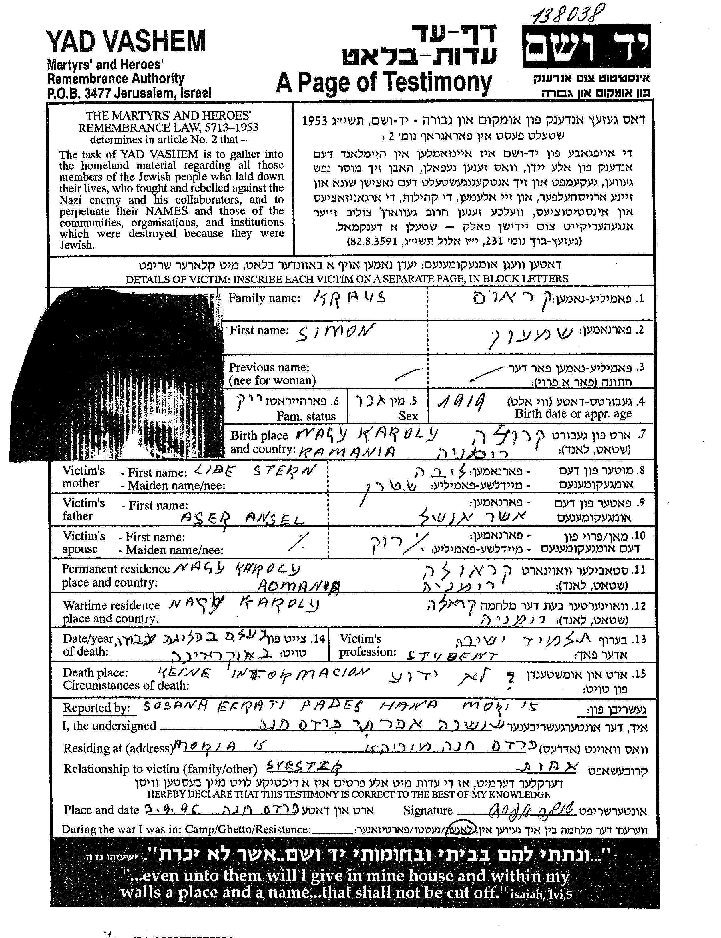 Shimon wurde in der Schoah ermordet. Todesort: Ukraine (UdSSR) im Jahr 1941.