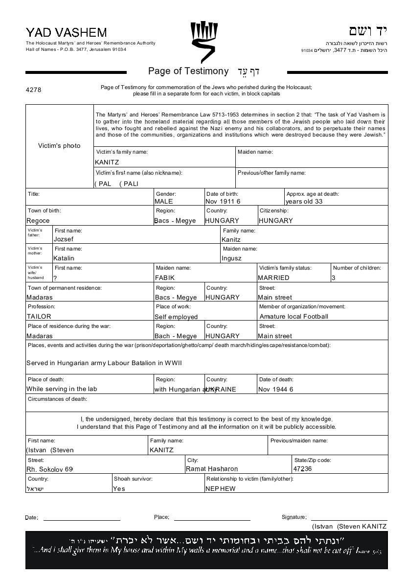 Pali Kanitz wurde im Jahr 1911 in Regoce, Jugoslawien geboren. Er war Schneider. Vor dem Zweiten Weltkrieg lebte er in Madaras, Ungarn.