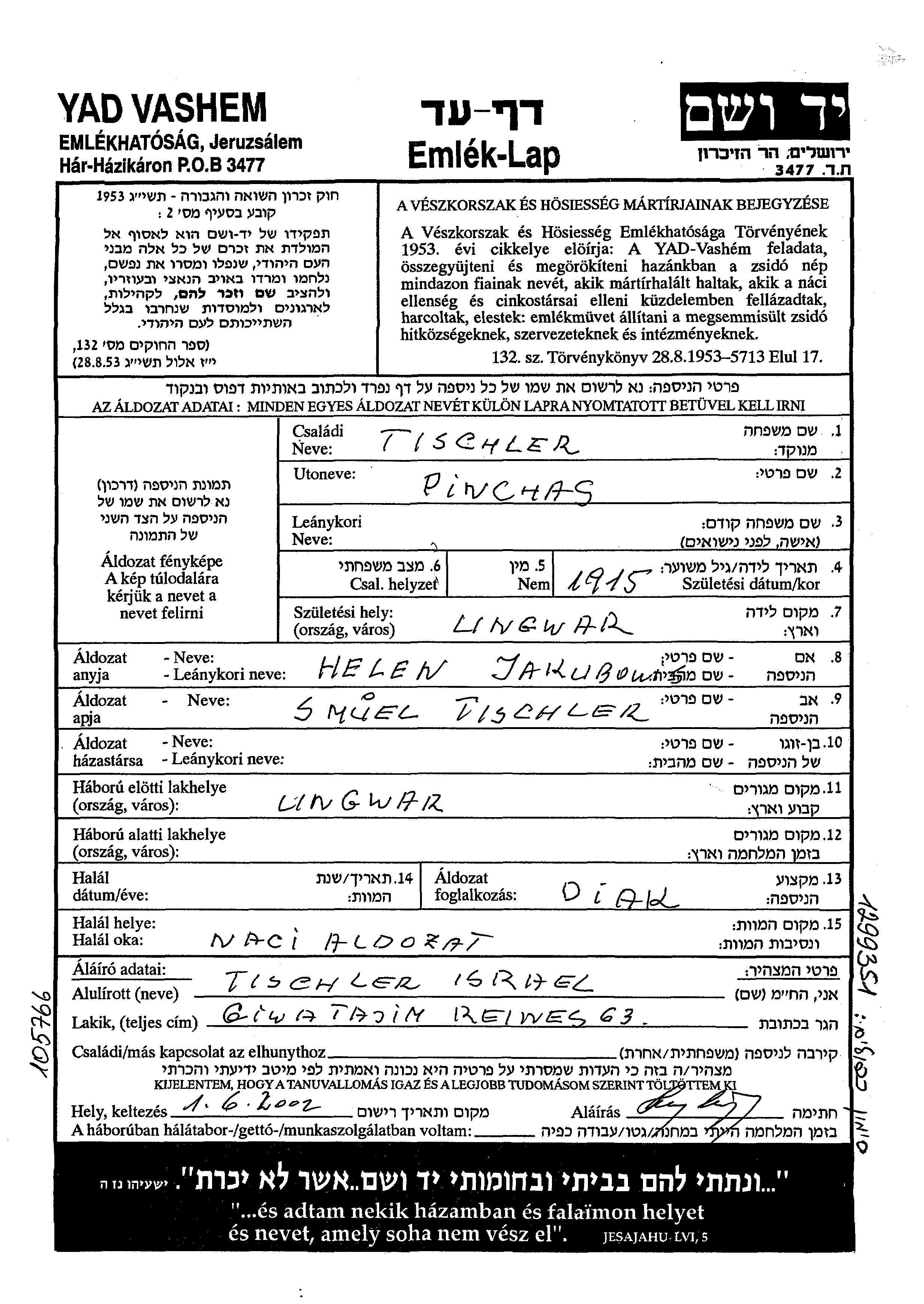 Tischler Pinchas 1915 Ungvar, Tschechoslowakei Gedenkblatt