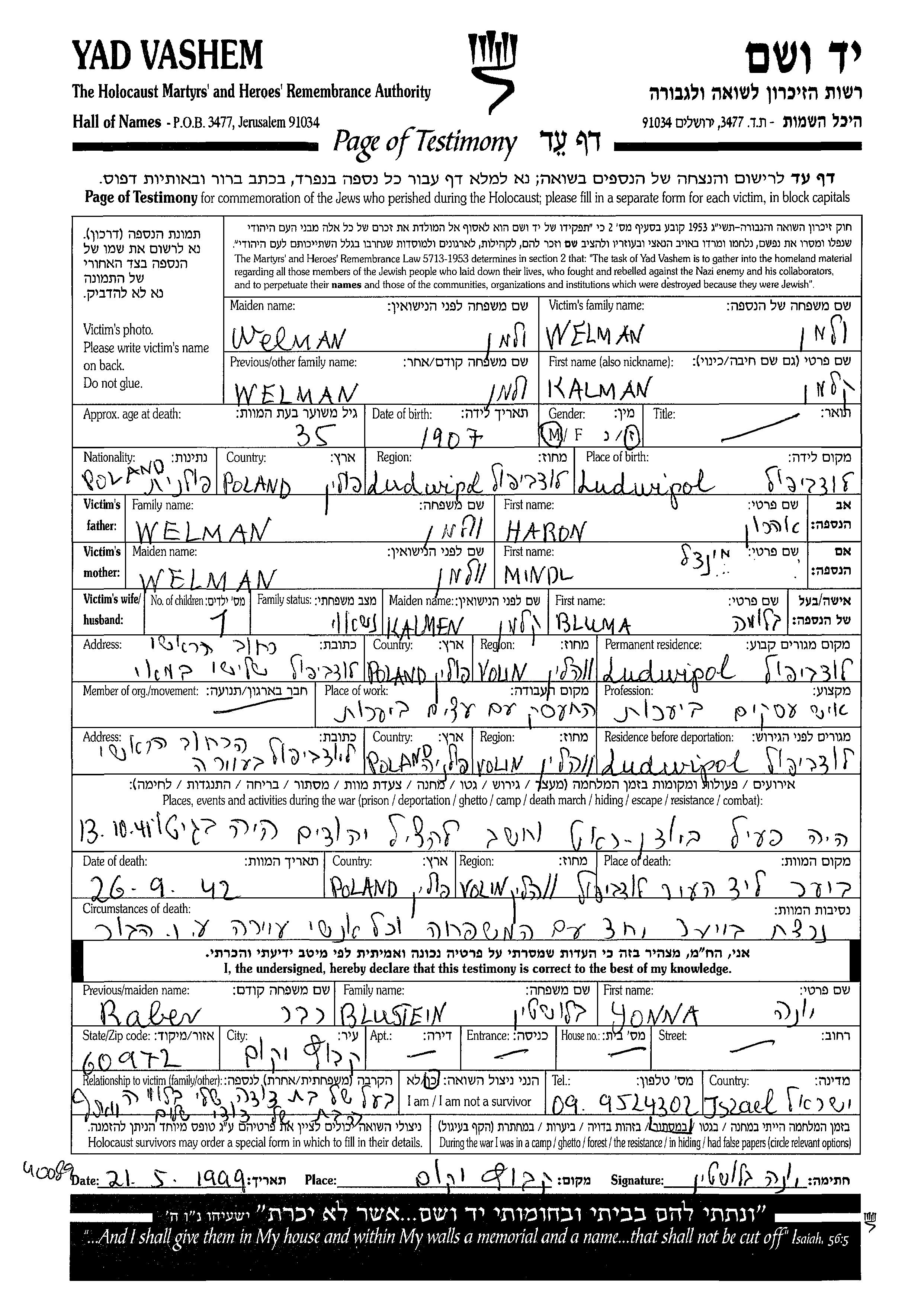 Kalman Welman wurde in Ludwipol, Polen geboren. Vor dem Zweiten Weltkrieg lebte er in Ludwipol, Polen.