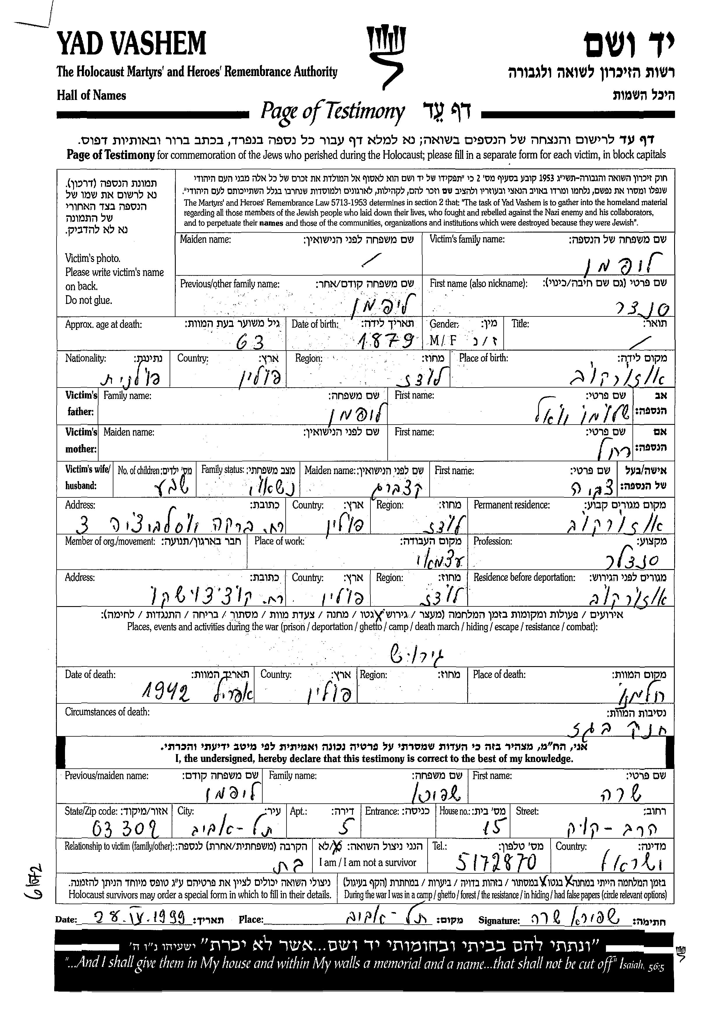 Aleksander wurde in der Schoah ermordet. Todesort: Chelmno, Polen im Jahr 04/1942.