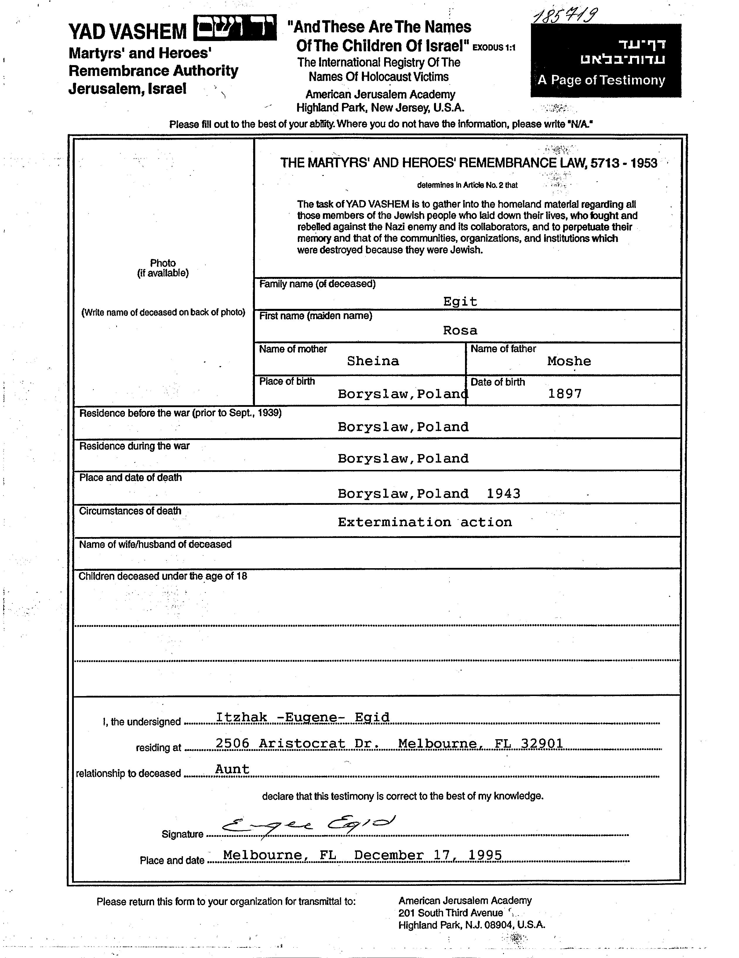 Roza Egid wurde im Jahr 1896 in Boryslaw, Polen geboren. Vor dem Zweiten Weltkrieg lebte sie in Boryslaw, Polen.