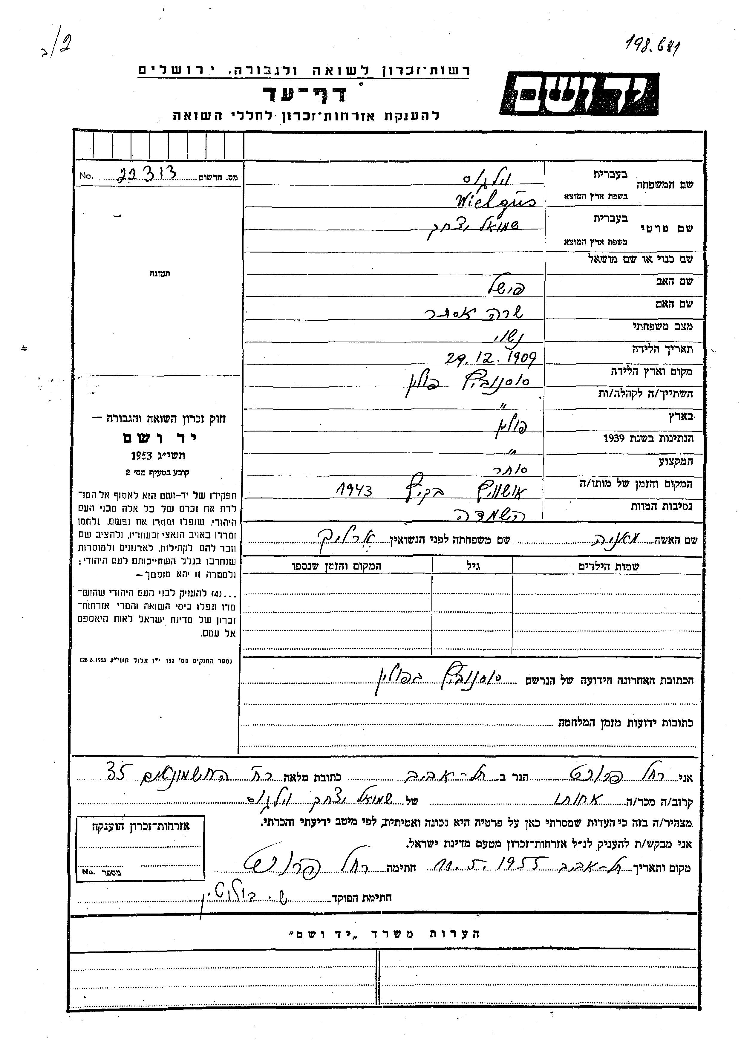 Wielgus | Shmuel Yitzkhak | 1909 | Sosnowiec, Polen | Gedenkblatt |