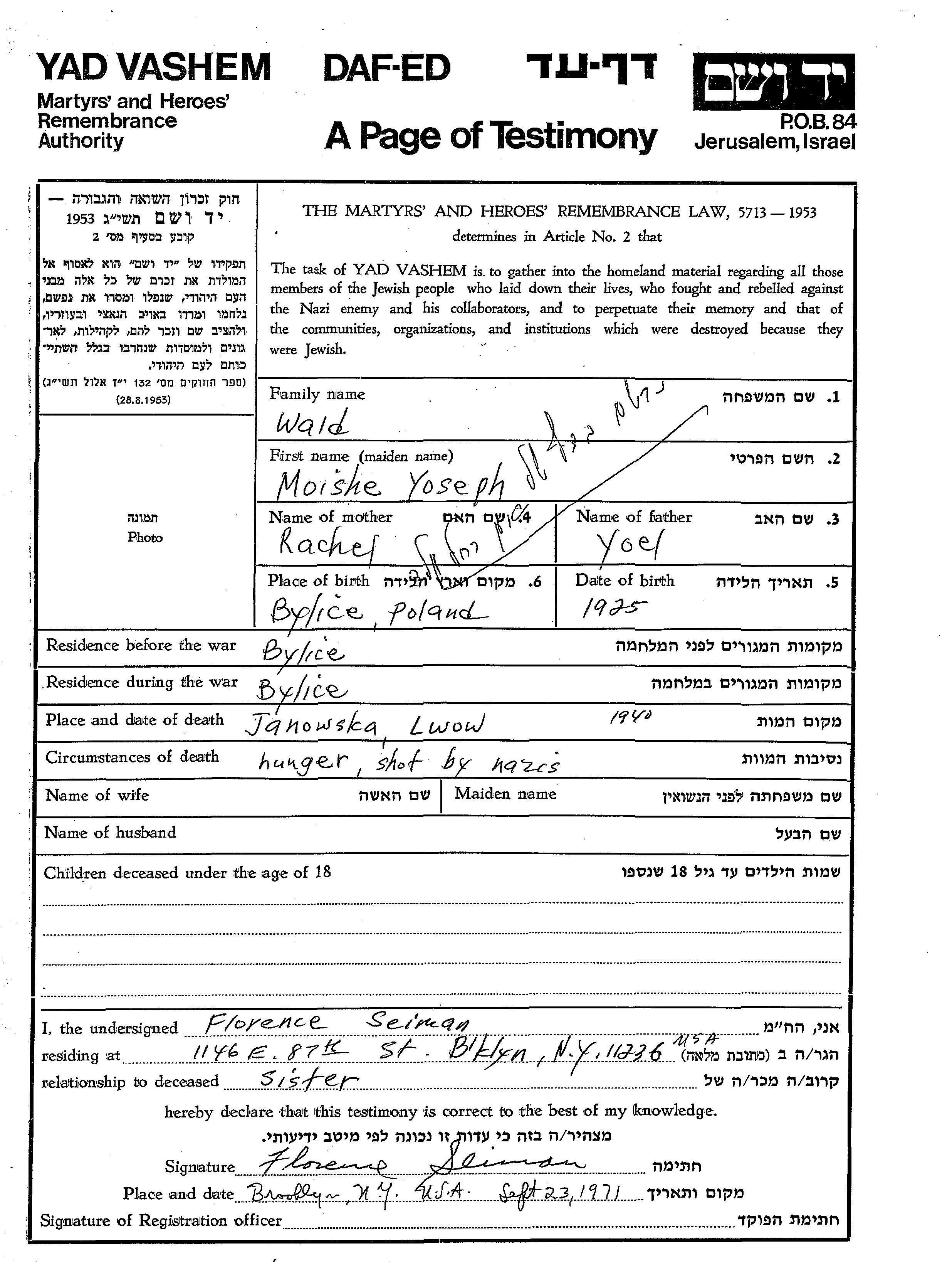 Yoseph Moishe Wald wurde im Jahr 1925 in Bylice, Polen geboren. Vor dem Zweiten Weltkrieg lebte er in Bylice, Polen.