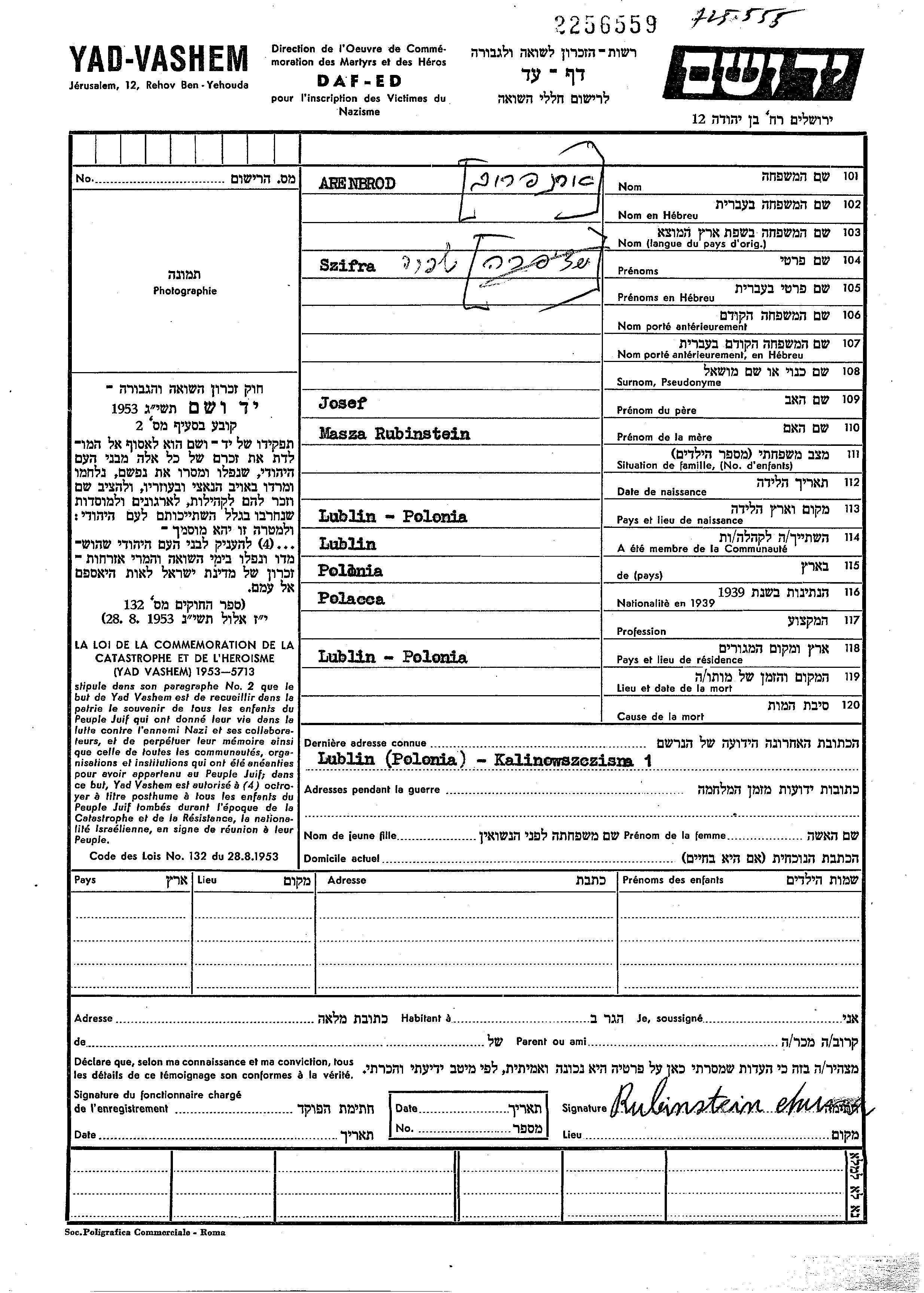 Szifra Arenbrod Armbrod wurde in Lublin, Polen geboren. Sie war die Tochter von Josef und Masza, geb. Rubinstein. Vor dem Zweiten Weltkrieg lebte sie in Lublin, Polen.