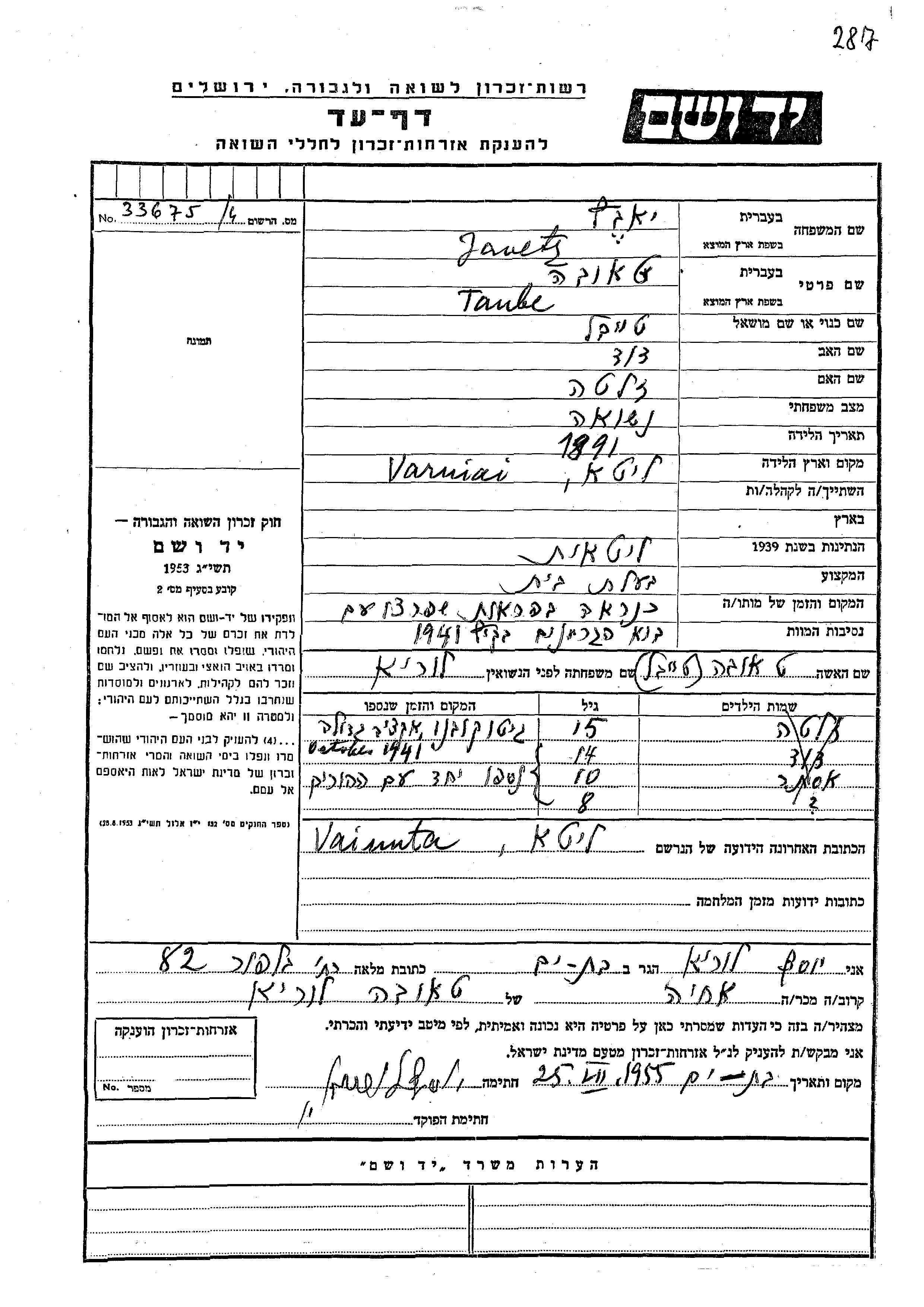 Javetz Ester Vainuta, Litauen Gedenkblatt
