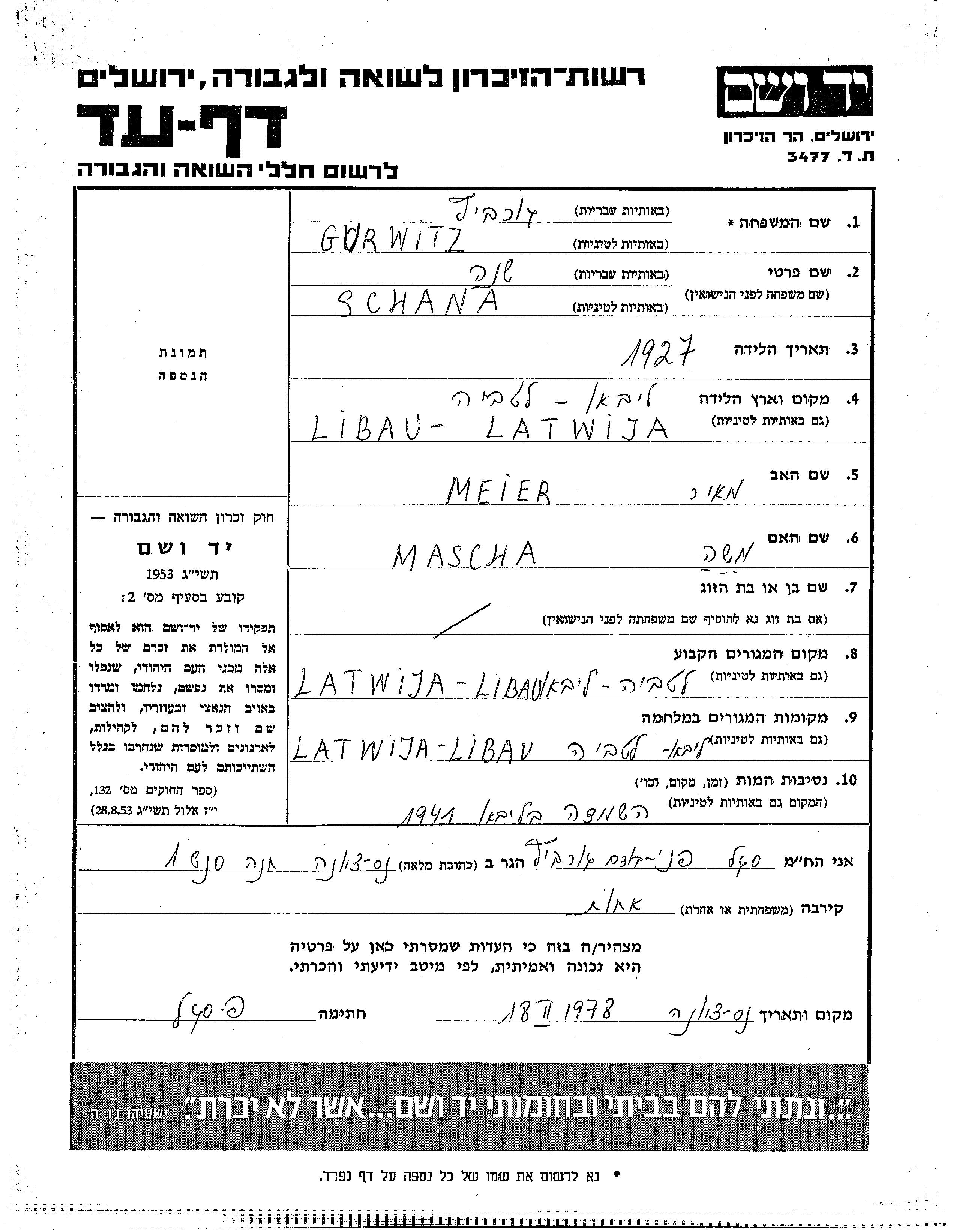 Gurwitz Szane Shena Libau, Lettland Gedenkblatt