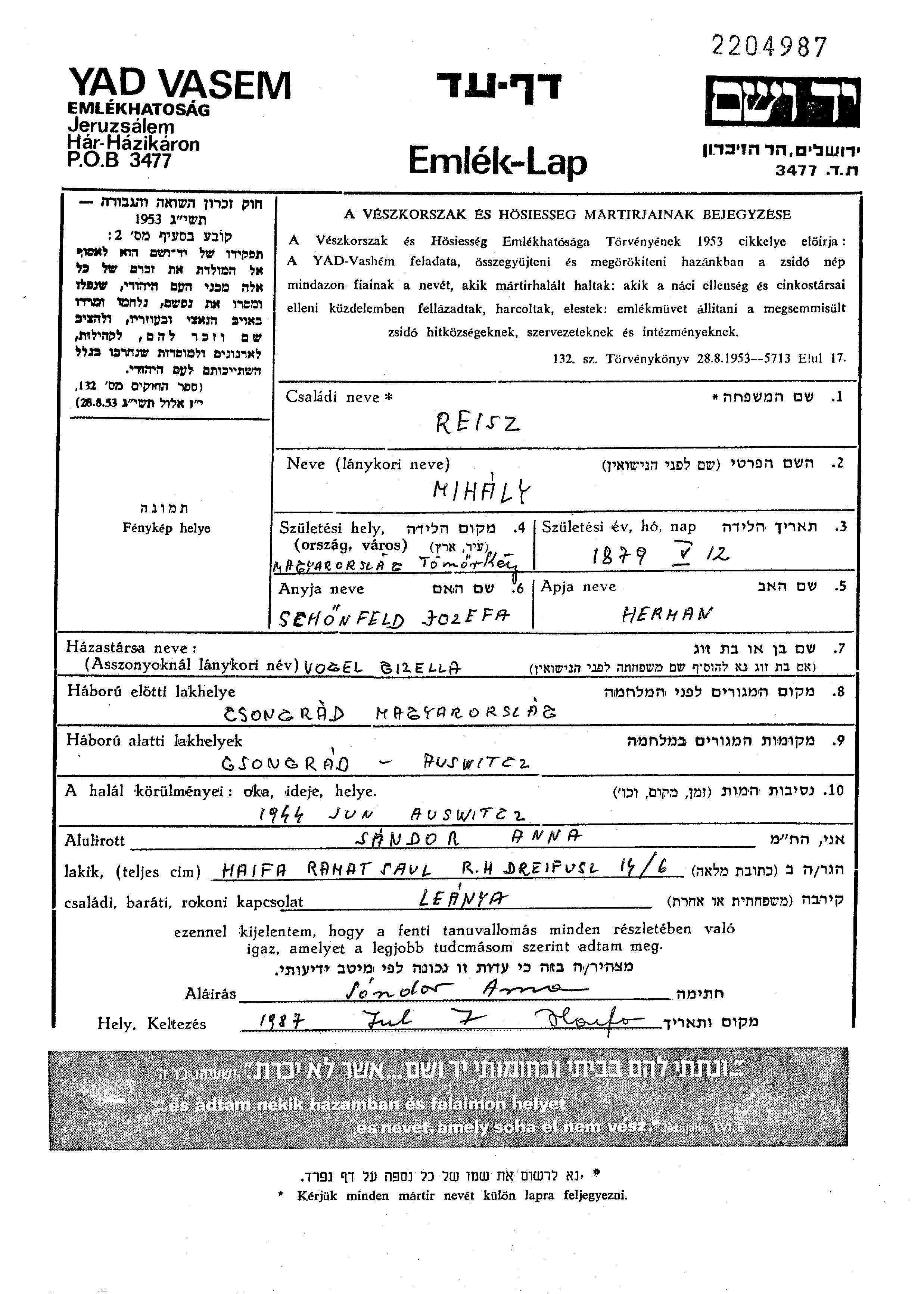 Reis Reisz | Mihaly | 1880 | Csongrad, Ungarn | Gedenkblatt |