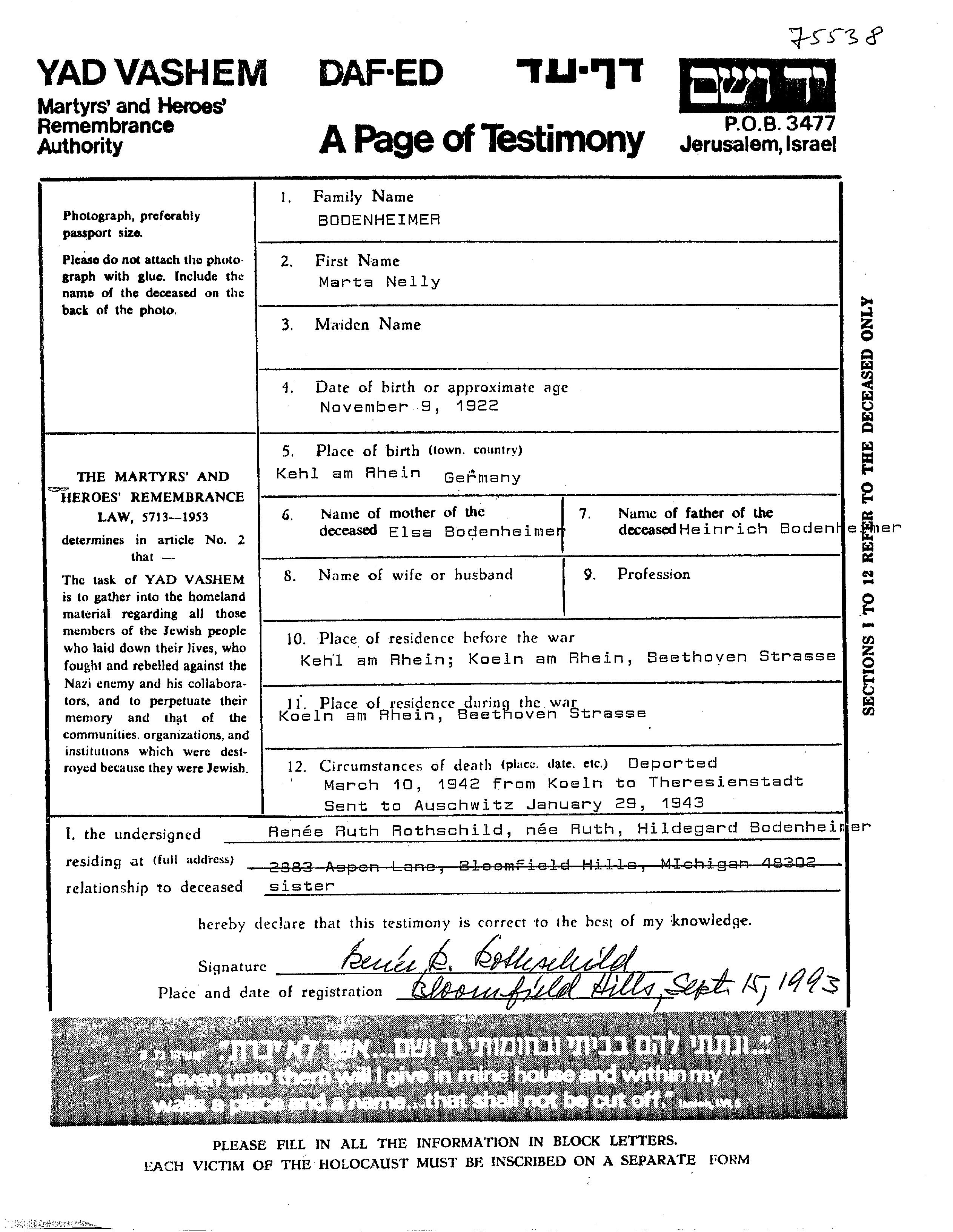 Mata Marta Nelly Bodenheimer wurde im Jahr 1922 in Kehl, Deutsches Reich geboren. Vor dem Zweiten Weltkrieg lebte sie in Kehl, Deutsches Reich.