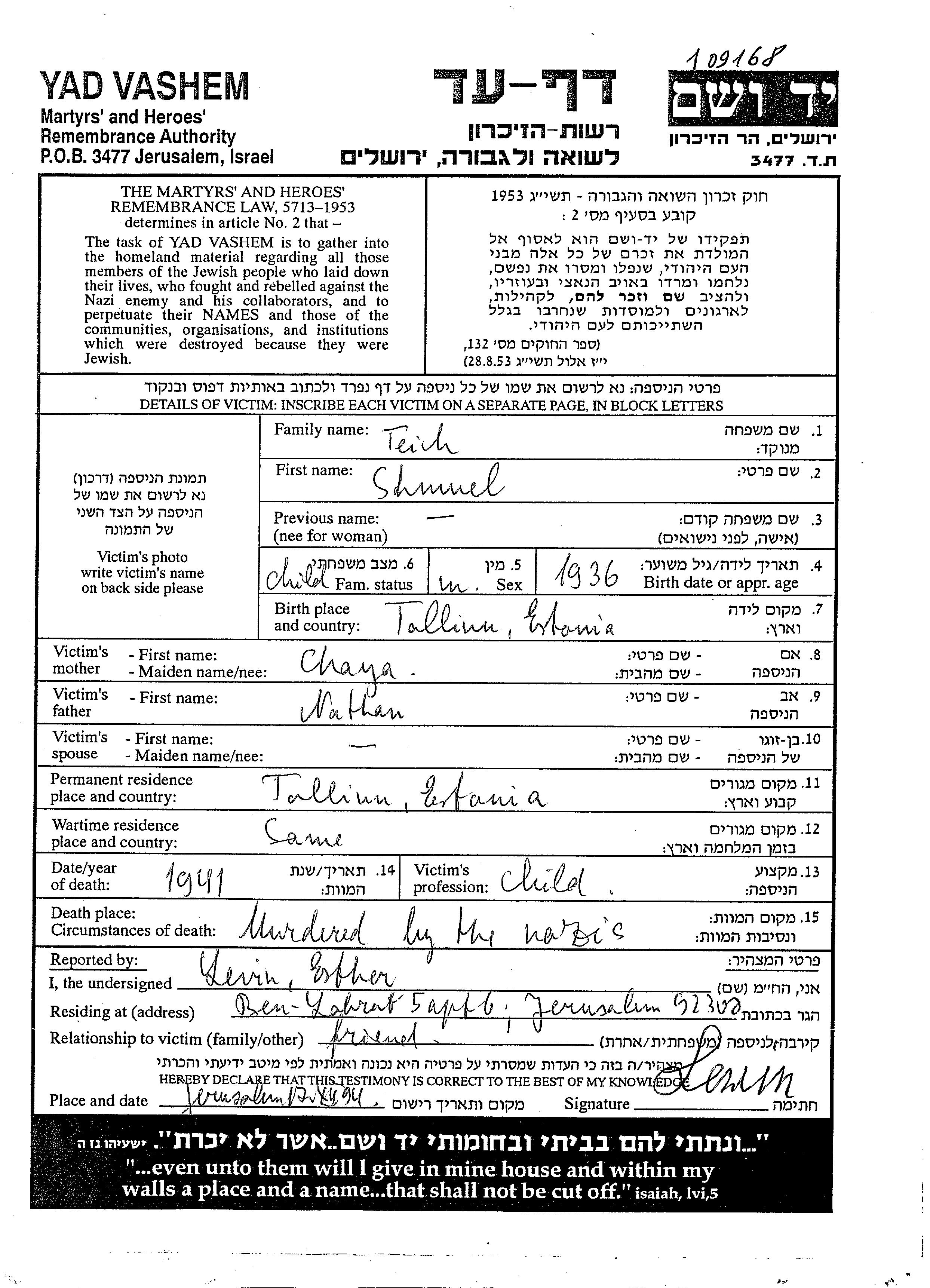 Shmuel Teich wurde in Tallinn, Estland geboren. Vor dem Zweiten Weltkrieg lebte er in Tallinn, Estland.