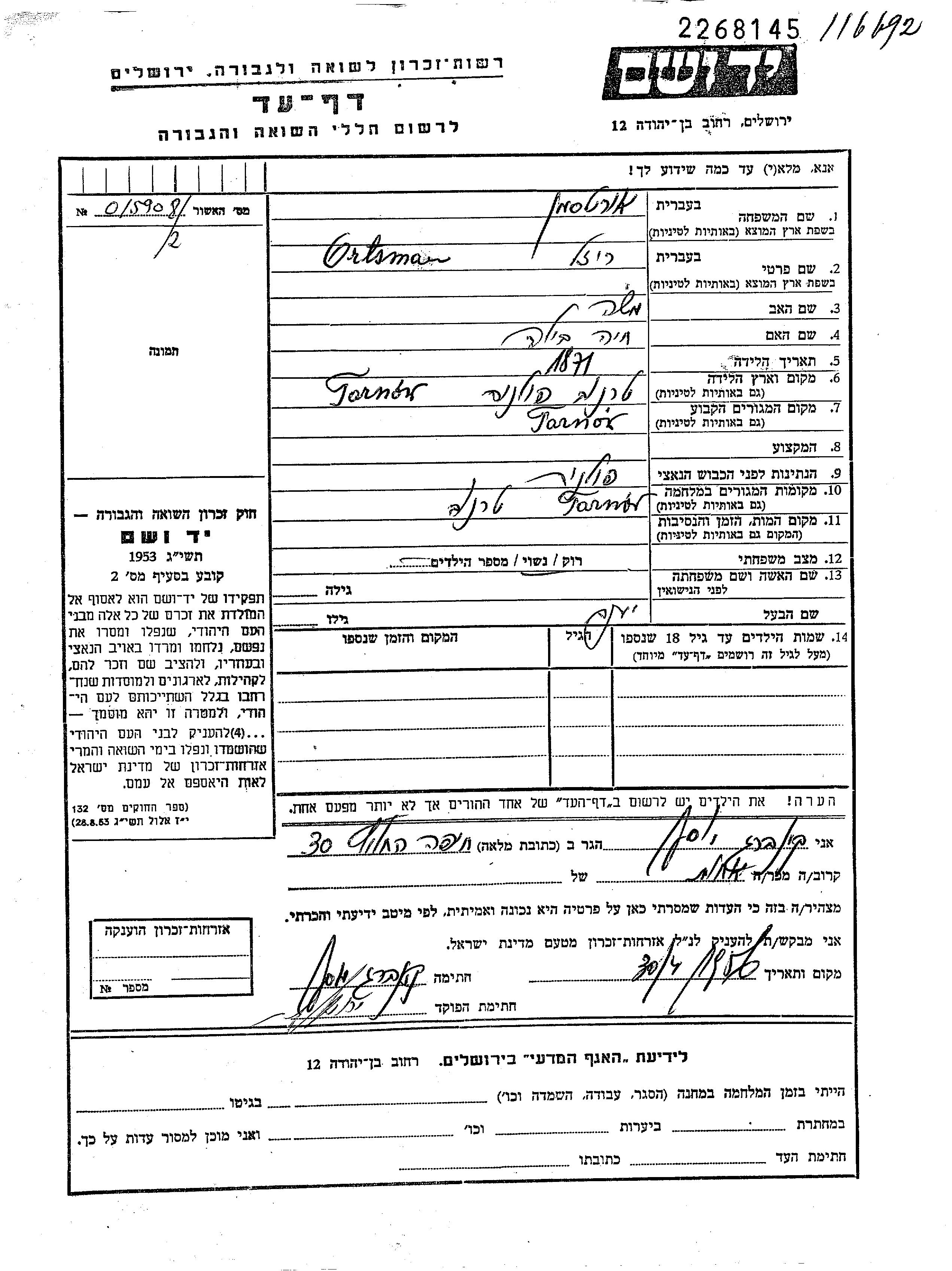 Raizel Ortsman wurde im Jahr 1871 in Tarnow, Polen geboren. Sie war die Tochter von Moshe und Beila Khaia. Sie war mit Yaakov Verheiratet. Vor dem Zweiten Weltkrieg lebte sie in Tarnow, Polen. Während des Krieges war sie in Tarnow, Polen.
