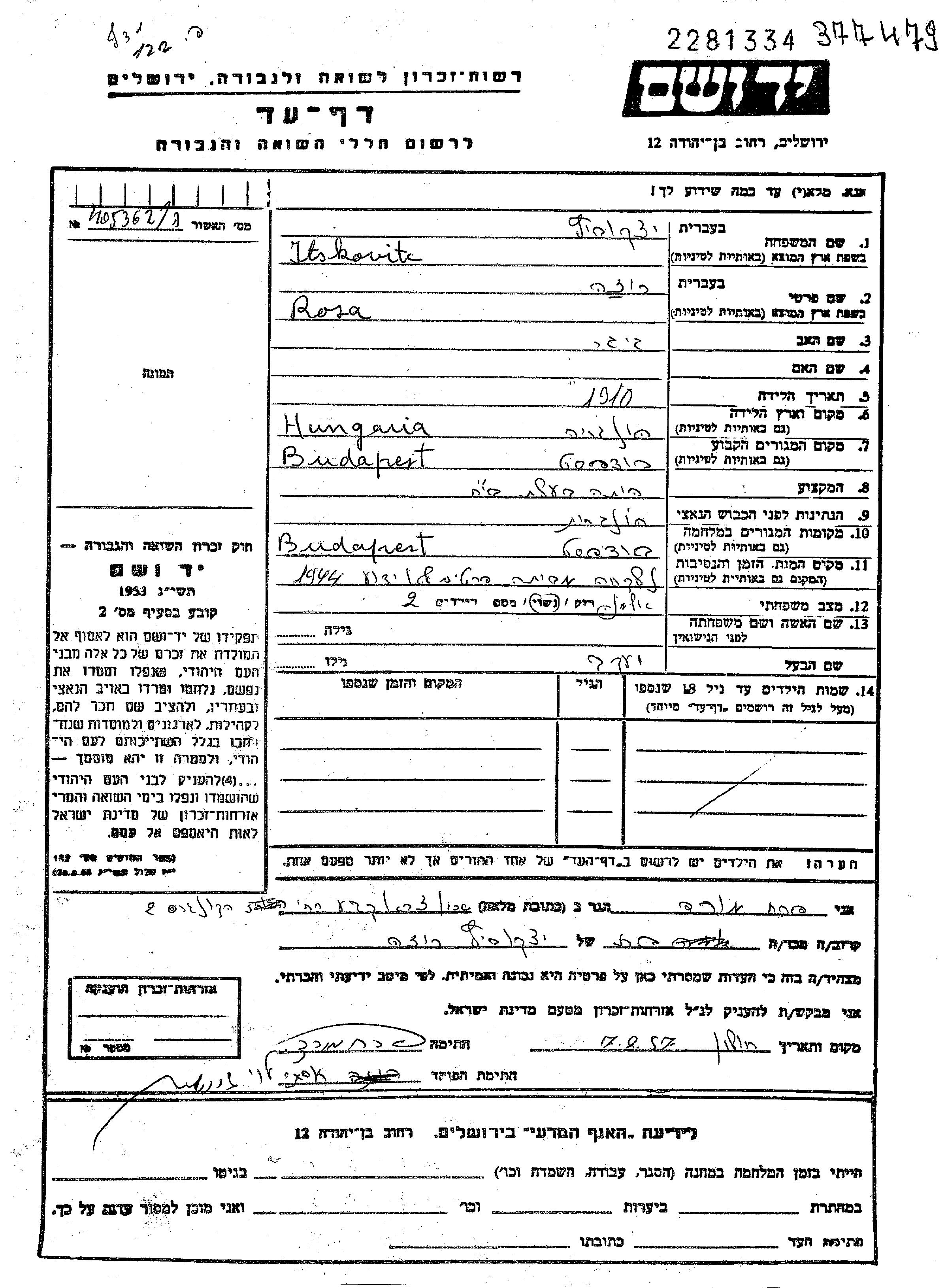 Rosa Itskovitc, geb. Geiger wurde im Jahr 1910 in Ungarn geboren. Sie war Fabrikant/-in und mit Yaakov Verheiratet. Vor dem Zweiten Weltkrieg lebte sie in Budapest, Ungarn. Während des Krieges war sie in Budapest, Ungarn.