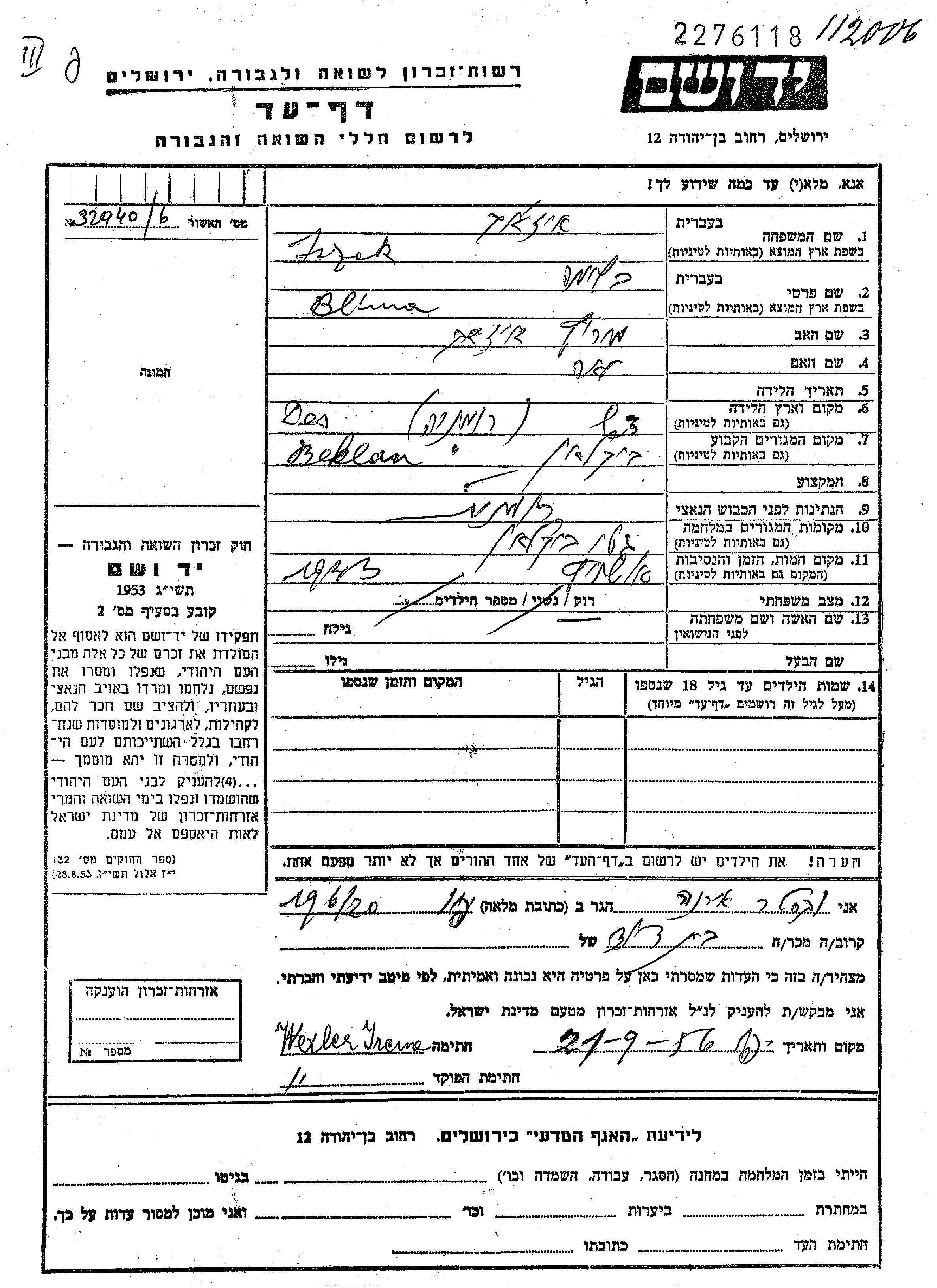 Blima wurde in der Schoah ermordet. Todesort: Auschwitz, Polen im Jahr 1943.