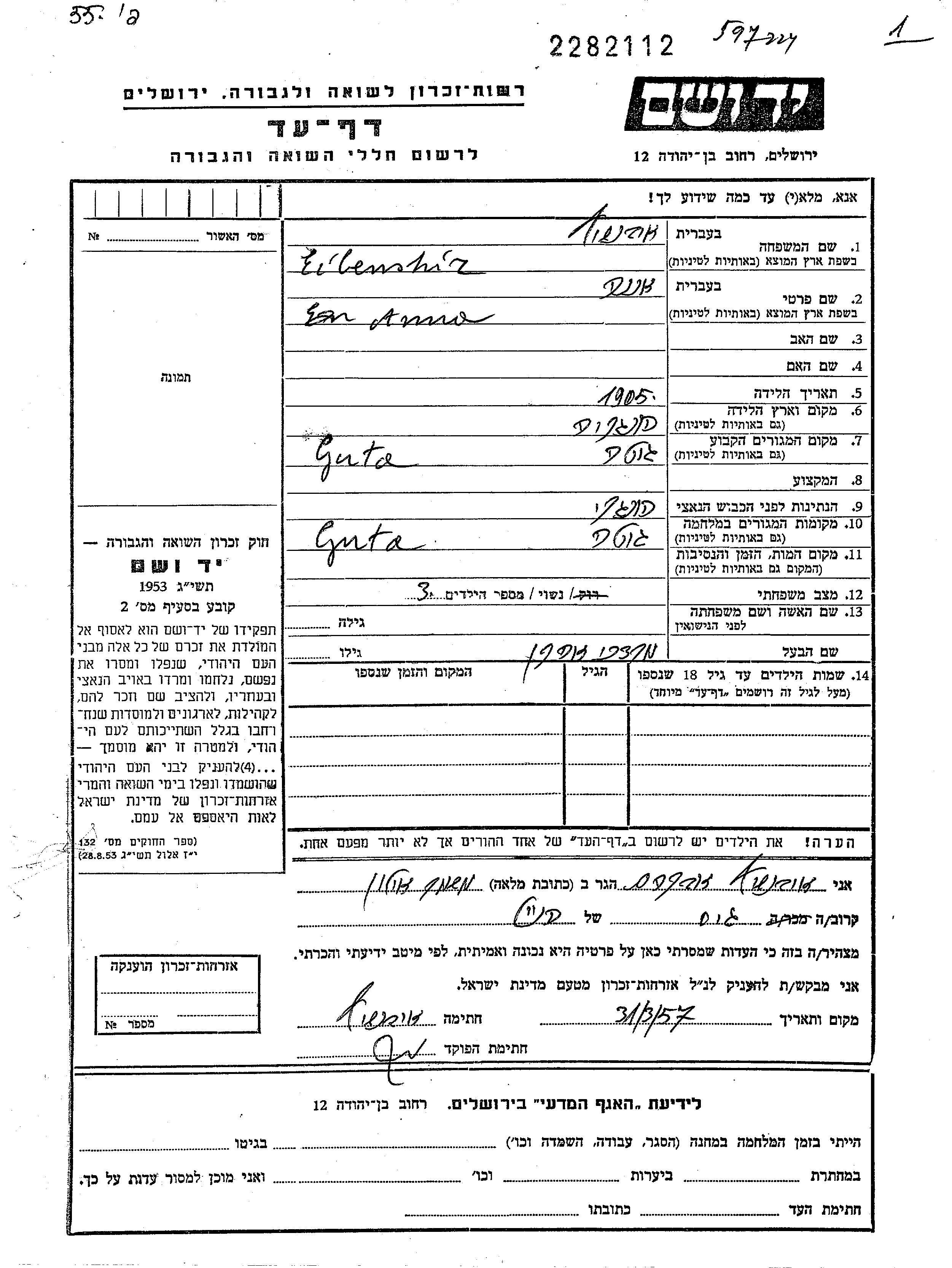 Anna Eibenshiz wurde im Jahr 1905 in Ungarn geboren. Sie war mit Mordechaj Aharon Verheiratet. Vor dem Zweiten Weltkrieg lebte sie in Guta, Tschechoslowakei. Während des Krieges war sie in Guta, Tschechoslowakei.