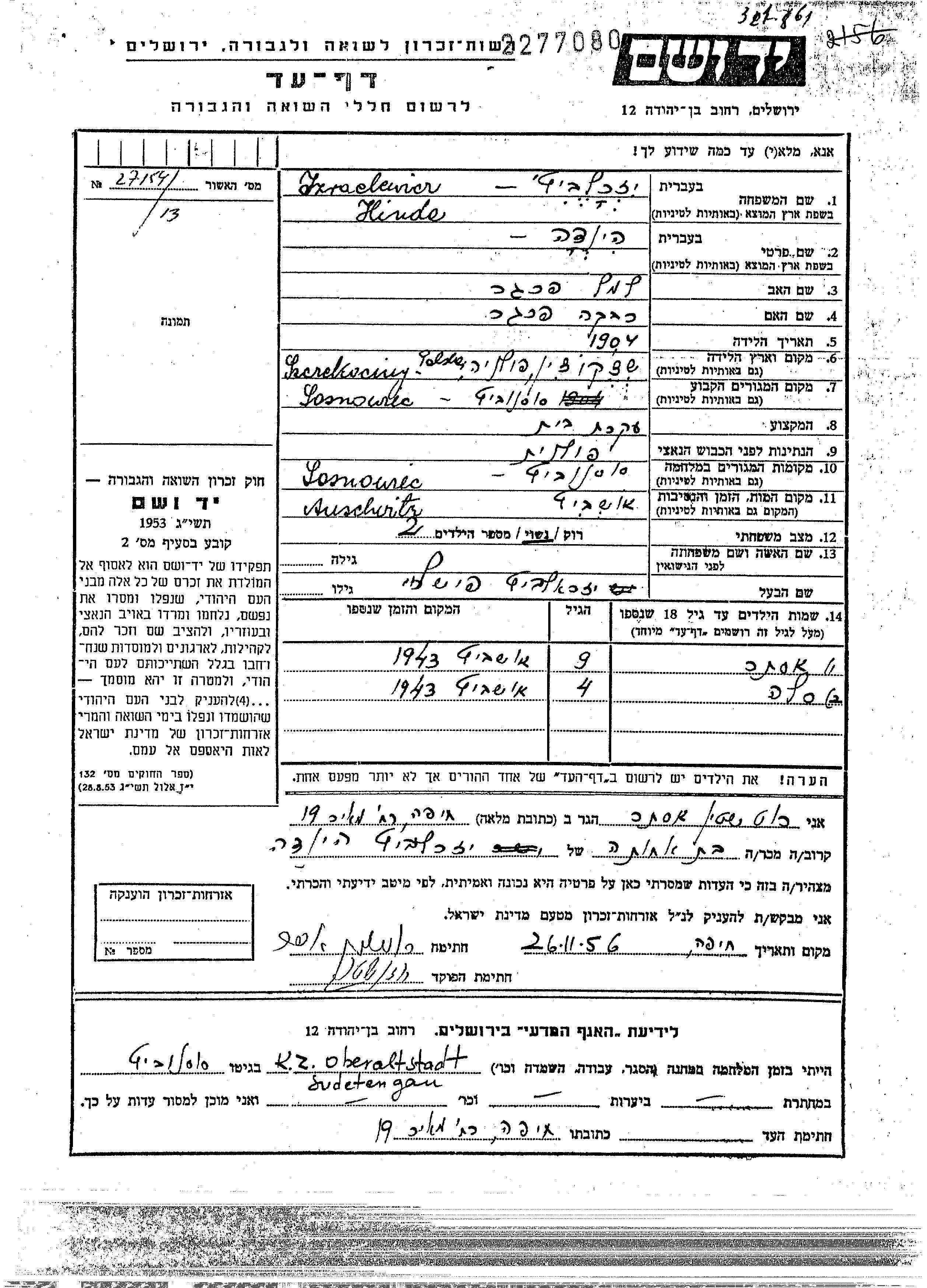 Izraelewicz Sala 1939 Sosnowiec, Polen Gedenkblatt