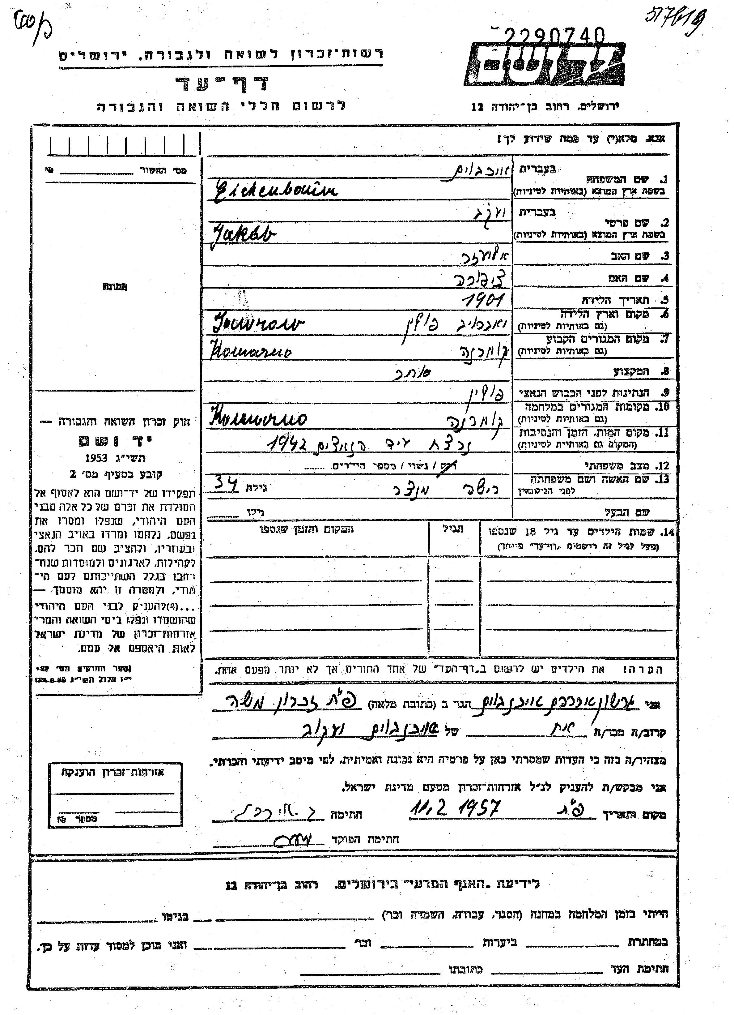 Eichenboum Jakov 1901 Komarno, Polen Gedenkblatt