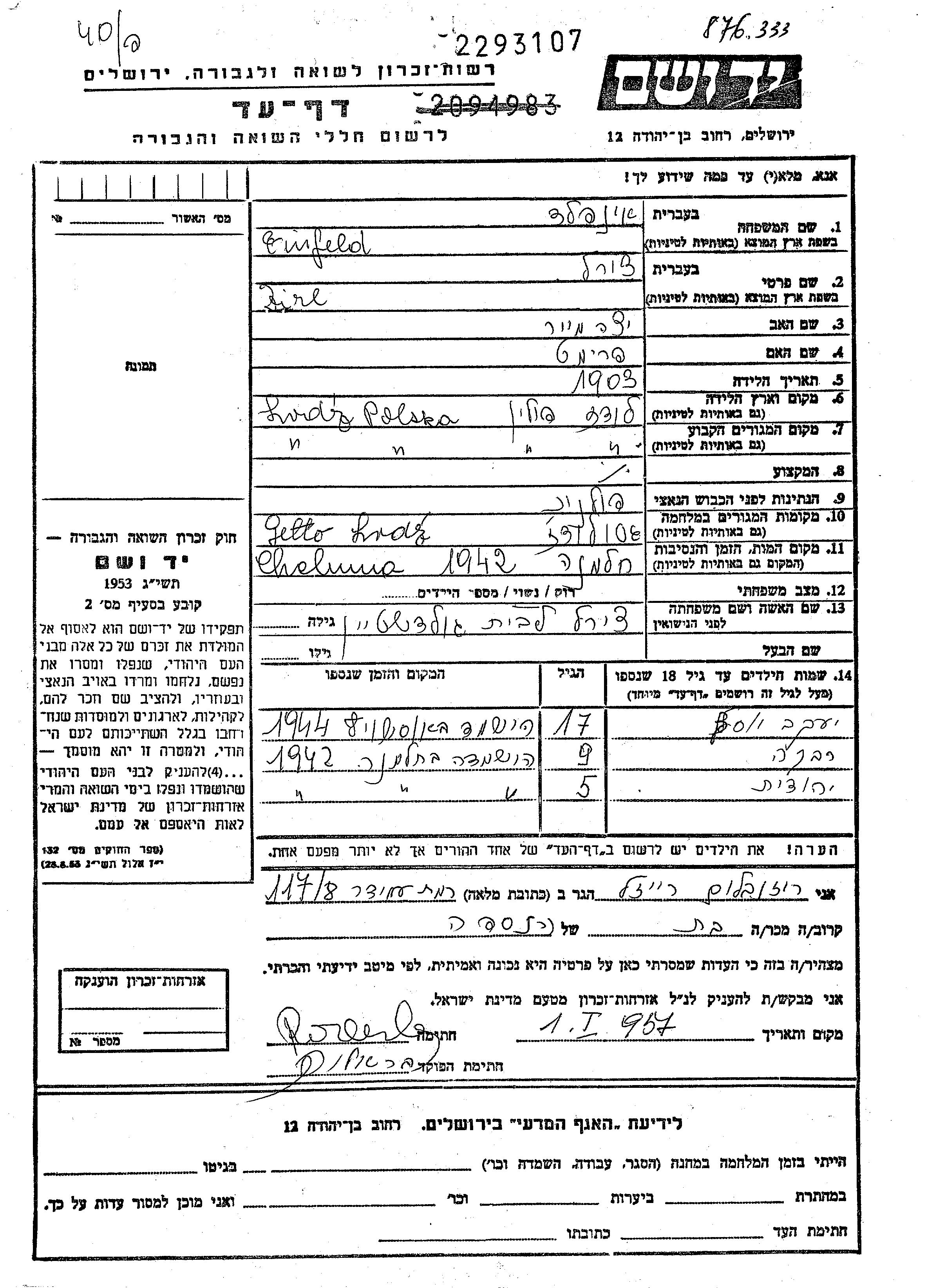 Cirl Einfeld, geb. Goldshtain wurde im Jahr 1903 in Lodz, Polen geboren. Sie war die Tochter von Ida Ida Meier und Frimat. Sie war Verheiratet. Vor dem Zweiten Weltkrieg lebte sie in Lodz, Polen. Während des Krieges war sie in Lodz, Polen.