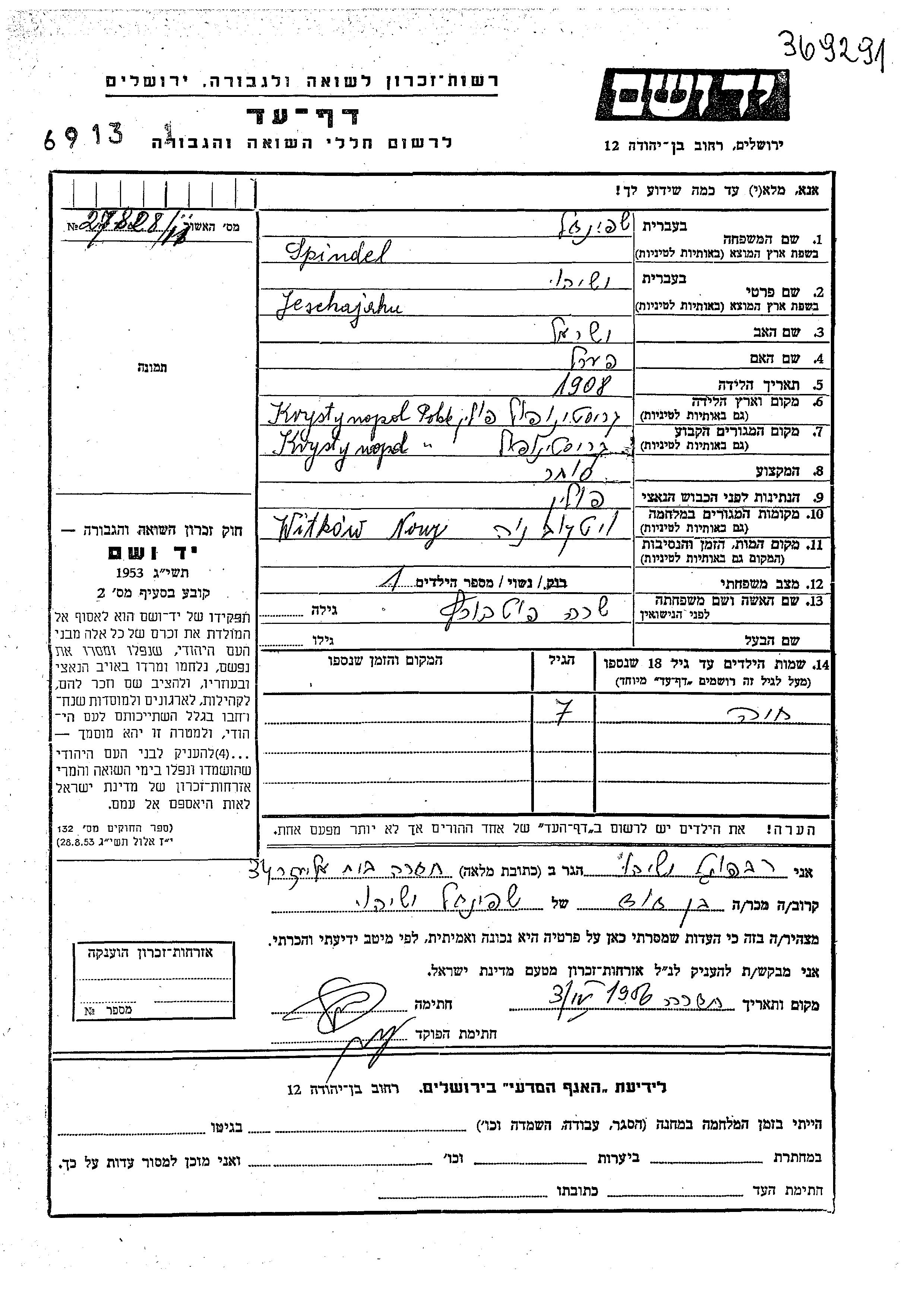 Jeschajahu Spindel wurde im Jahr 1908 in Krystynopol, Polen geboren. Er war der Sohn von Yisrael und Perl. Er war Kaufmann/-frau und mit Sara, geb. Pothortz Verheiratet. Vor dem Zweiten Weltkrieg lebte er in Krystynopol, Polen. Während des Krieges war er in Witkow Nowy, Polen.
