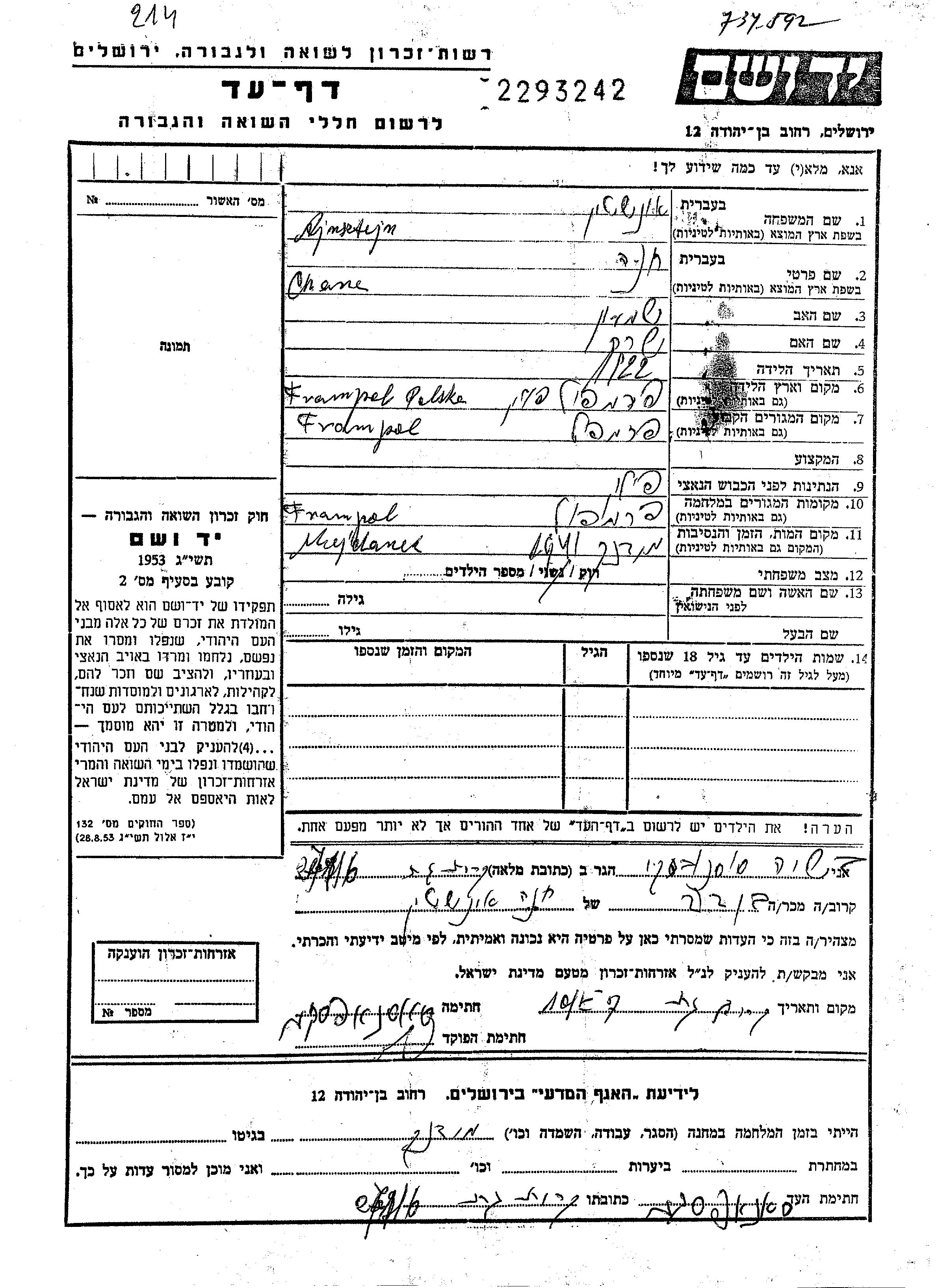 Ajnsztajn Chana 1922 Frampol, Polen Gedenkblatt