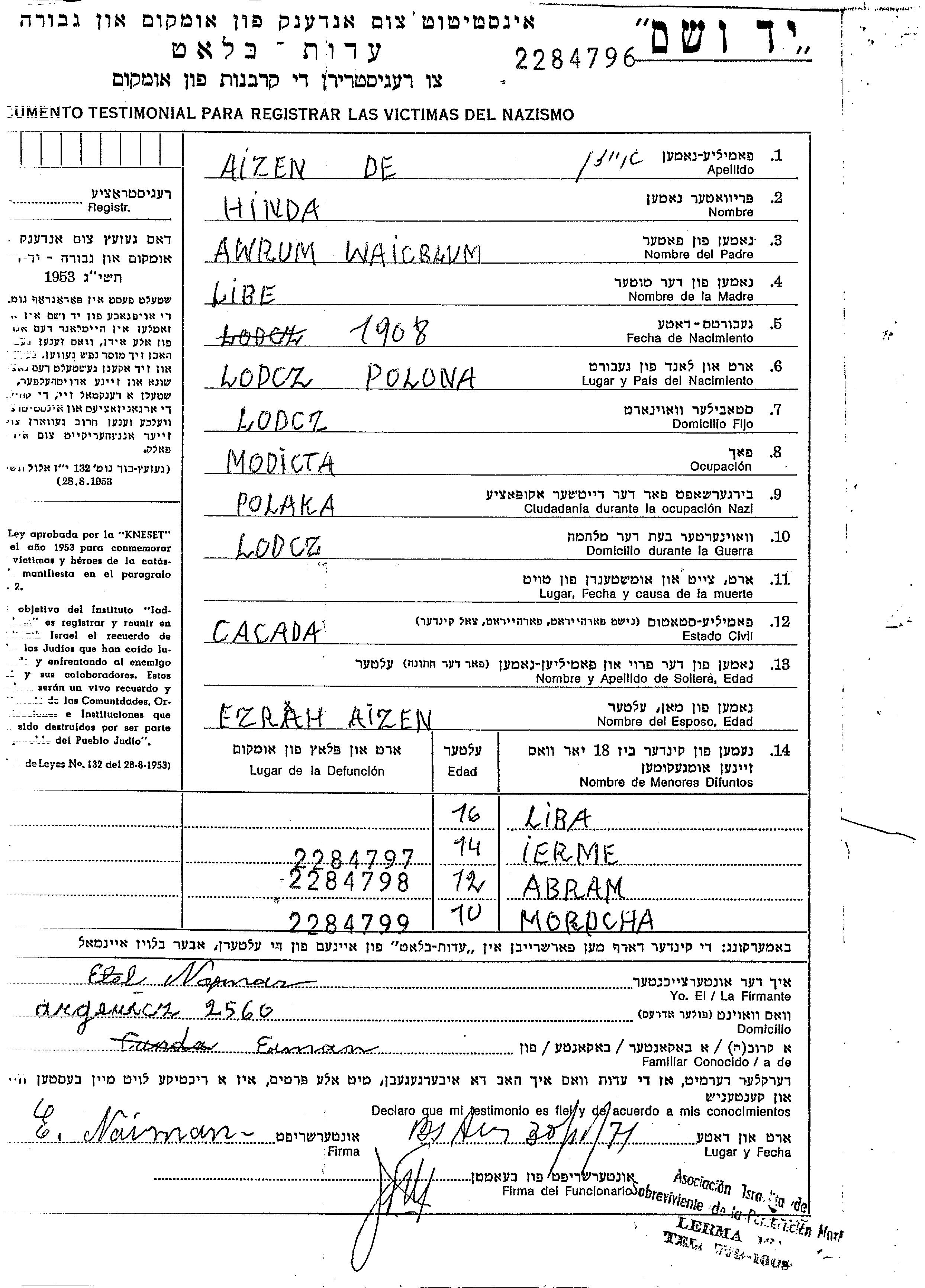 Liba Aizen wurde Sie war die Tochter von Ezrah Ezril und Hinda, geb. Waicblum. Sie war Kind. Vor dem Zweiten Weltkrieg lebte sie in Lodz, Polen.