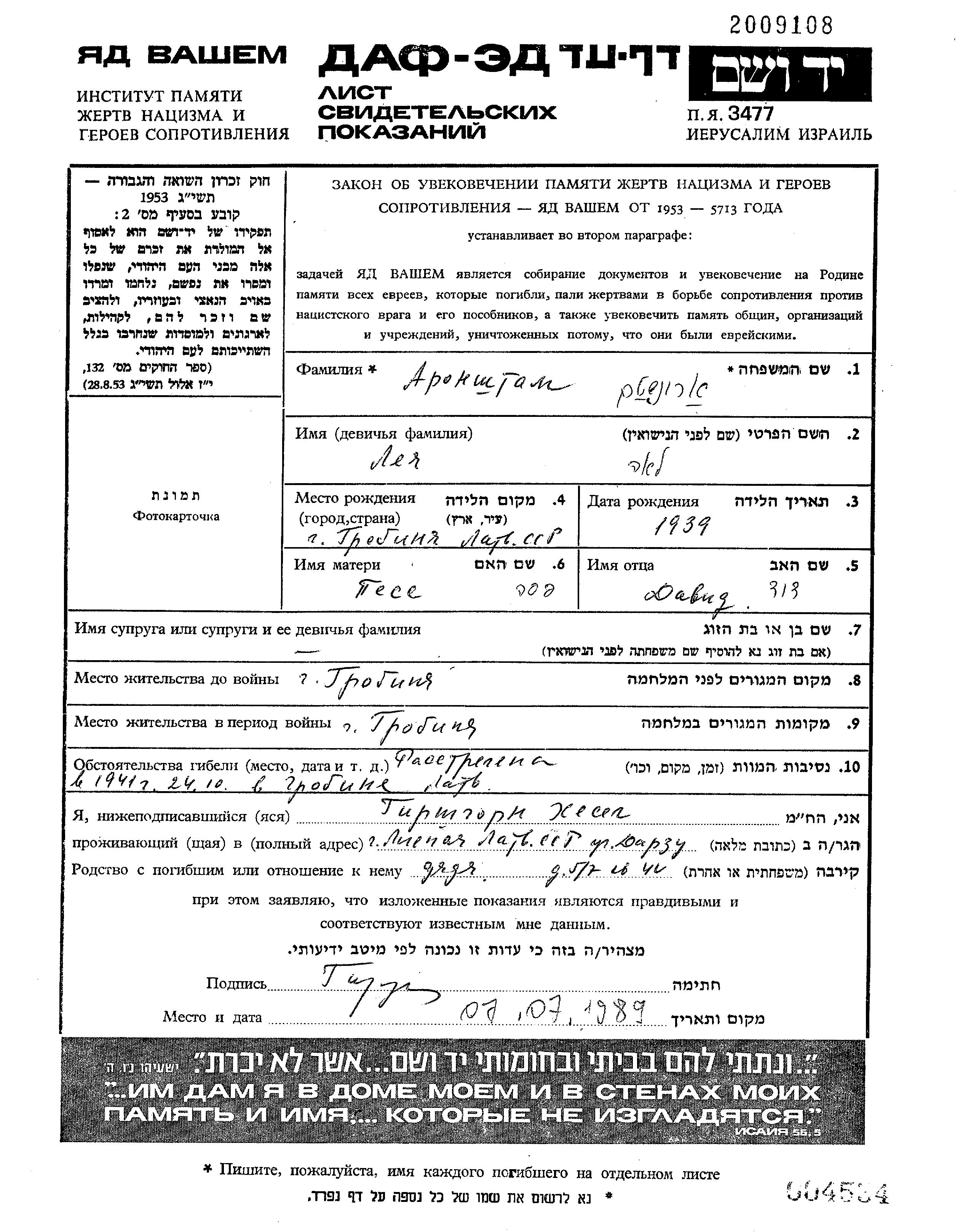 Aronshtam Leia 1939 Grobin, Lettland Gedenkblatt