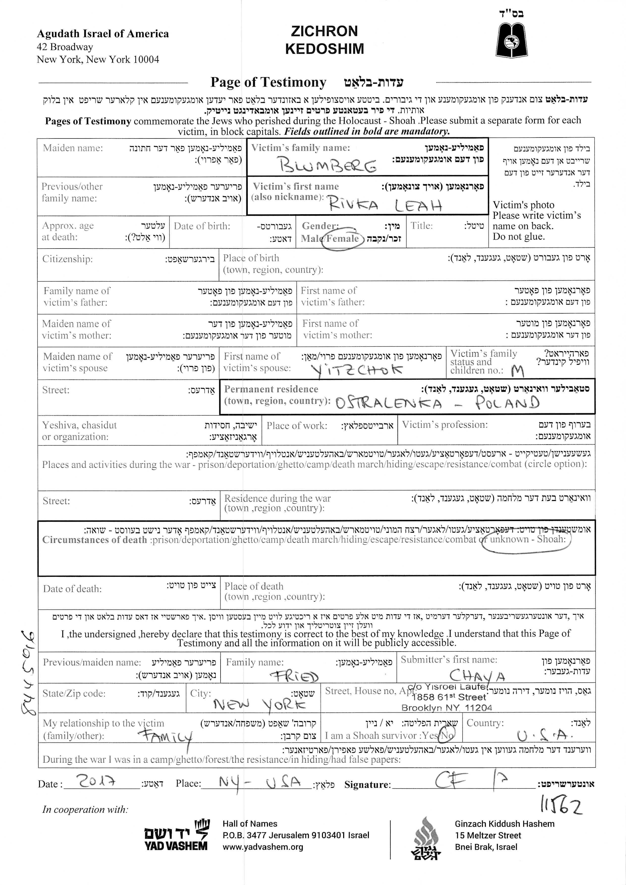 Rivka Leah Blumberg. Sie war mit Yitzchok Verheiratet. Vor dem Zweiten Weltkrieg lebte sie in Ostroleka, Polen.