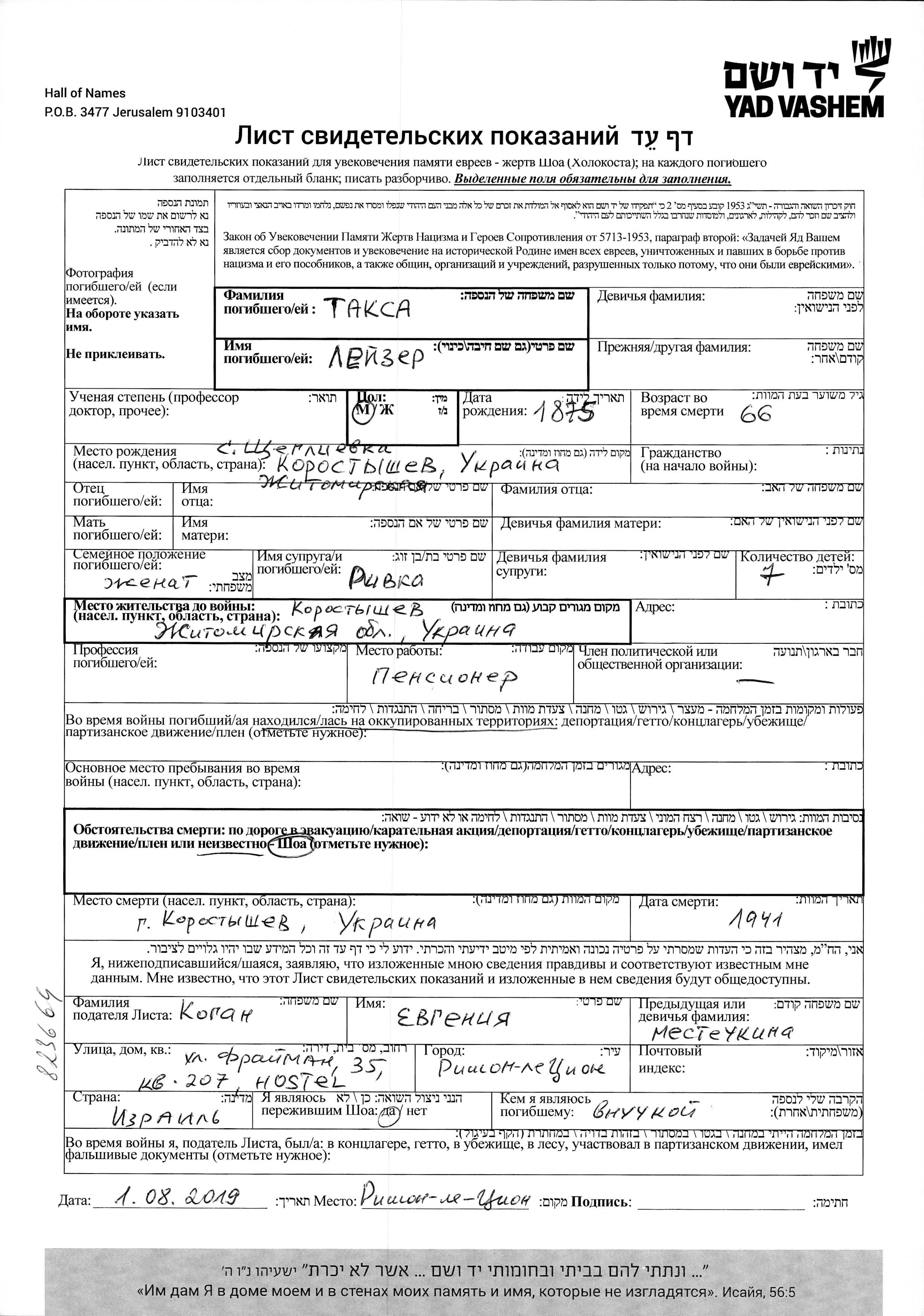 Leyzer Taksa wurde im Jahr 1875 in Shchegliyevka, Ukraine (UdSSR) geboren. Er war Rentner/-in und mit Rivka Verheiratet. Vor dem Zweiten Weltkrieg lebte er in Korostyshev, Ukraine (UdSSR). Während des Krieges war er in Korostyshev, Ukraine (UdSSR).