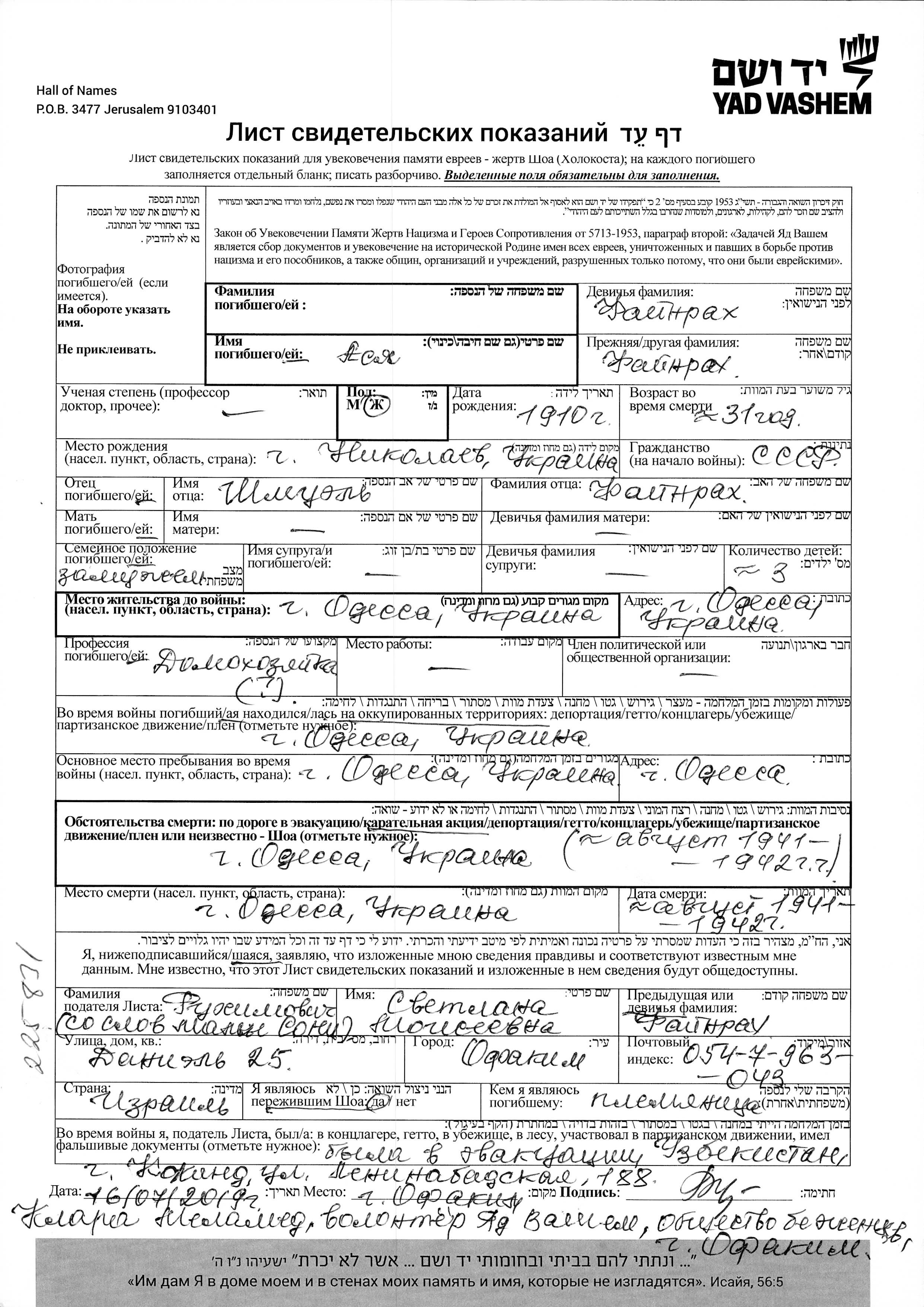 Asya Name unbekannt, geb. Faynrakh wurde im Jahr 1910 in Nikolayev, Ukraine (UdSSR) geboren. Sie war die Tochter von Shmuyel. Sie war Hausfrau und Verheiratet. Vor dem Zweiten Weltkrieg lebte sie in Odessa, Ukraine (UdSSR). Während des Krieges war sie in Odessa, Ukraine (UdSSR).
